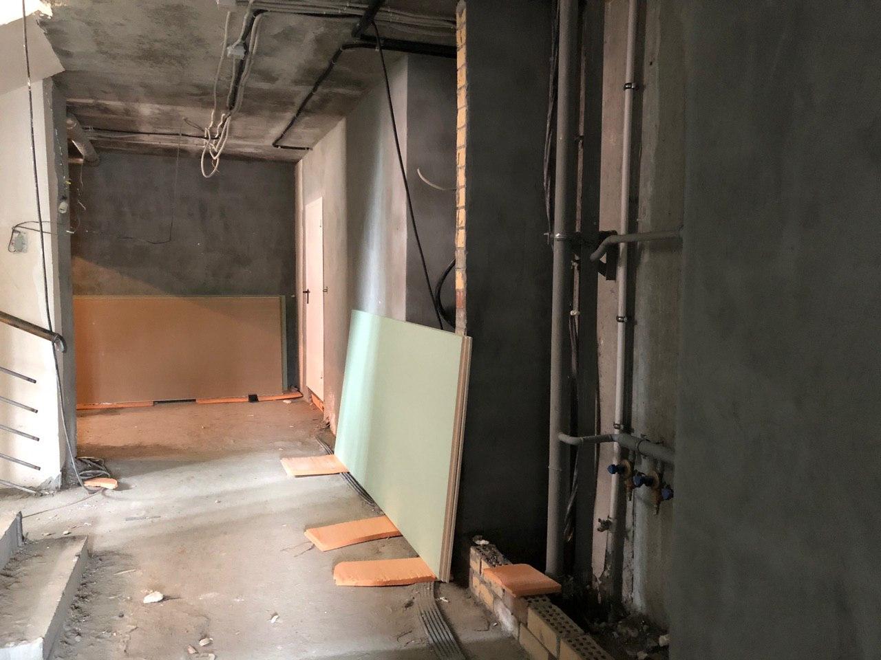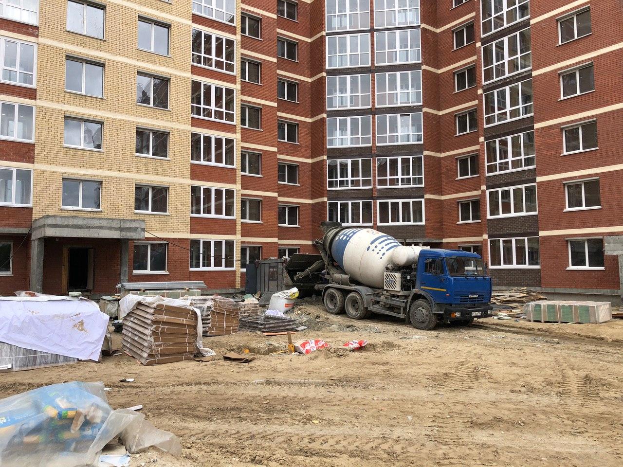 Ведутся внутренние чистовые отделочные работы. На строительной площадке находится порядка 60 человек. На улице продолжают делать раствор для стяжки пола первых этажей.