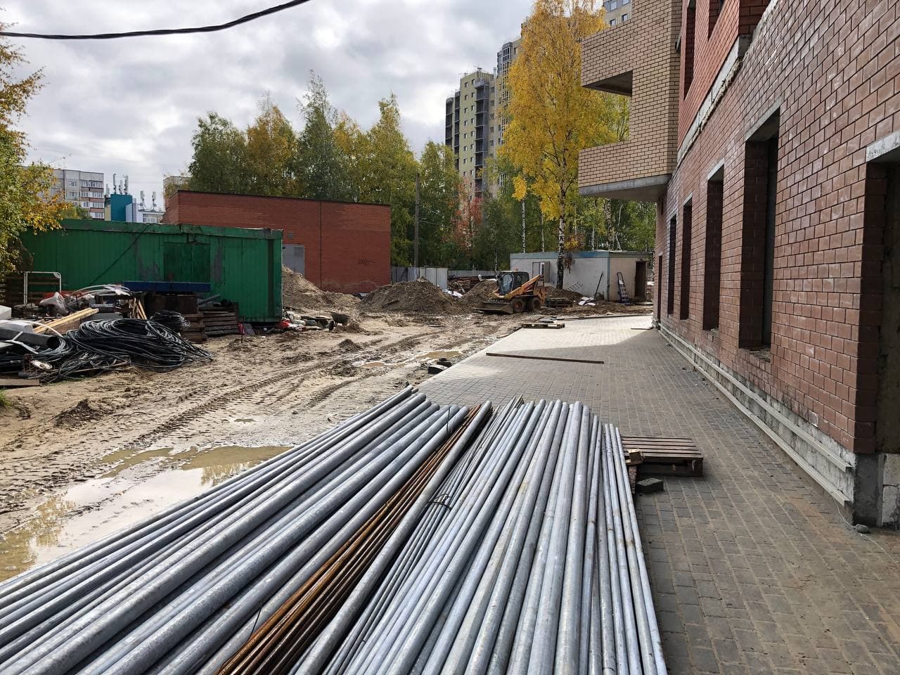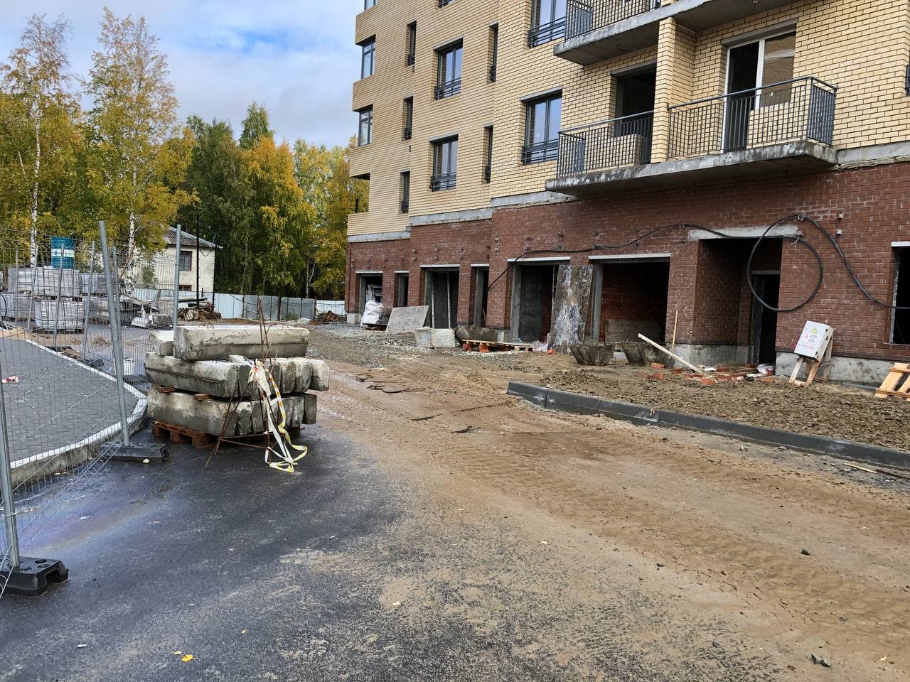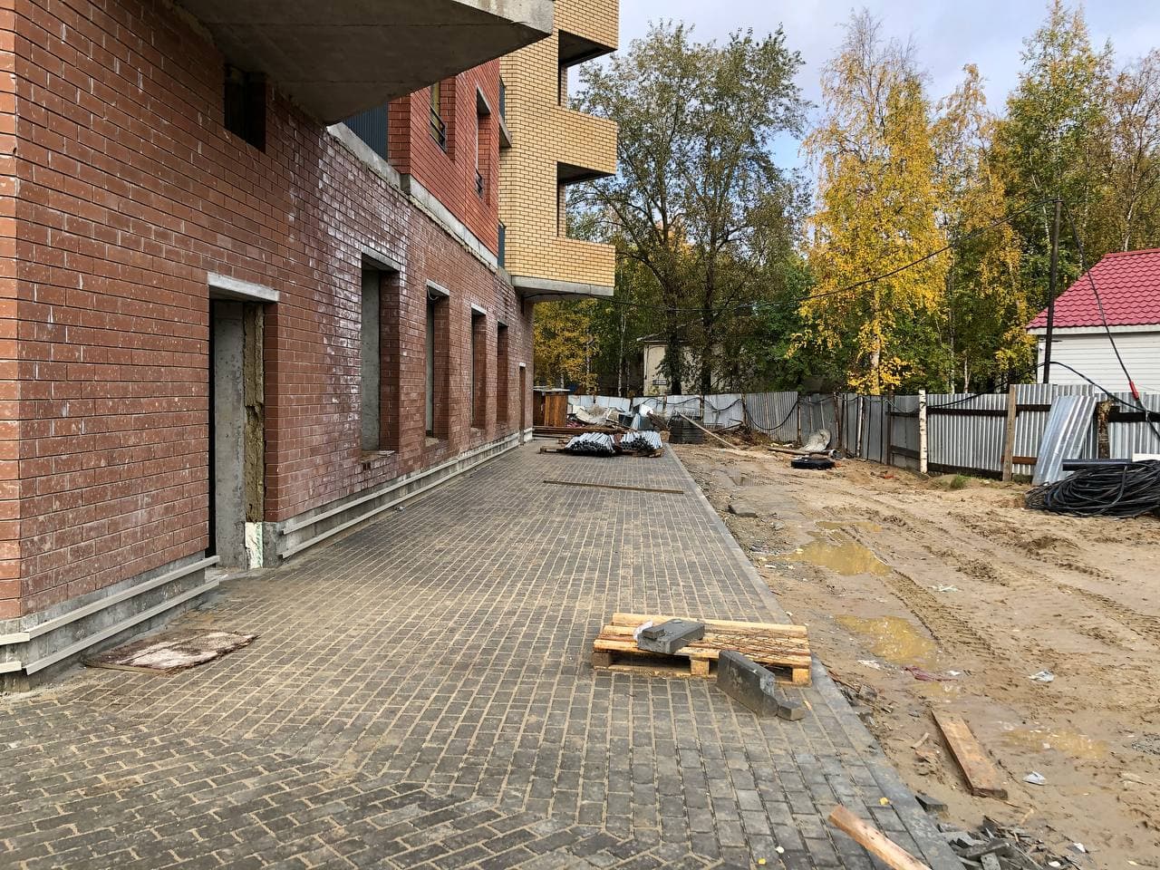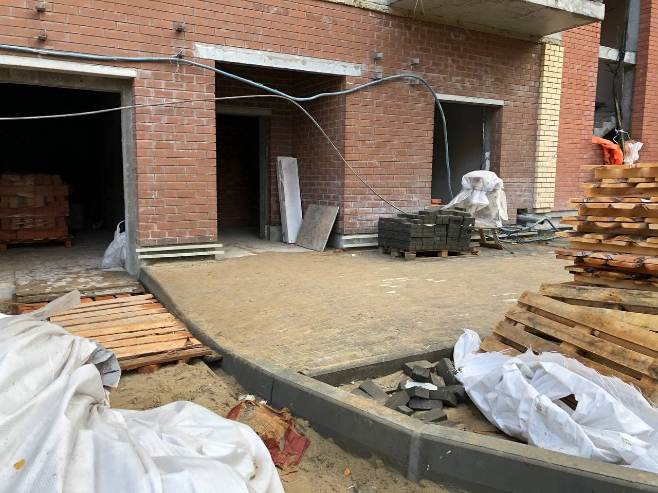 Выполняются работы по благоустройству территории, кладка тротуарной плитки, подготовка под асфальтирование проездов.