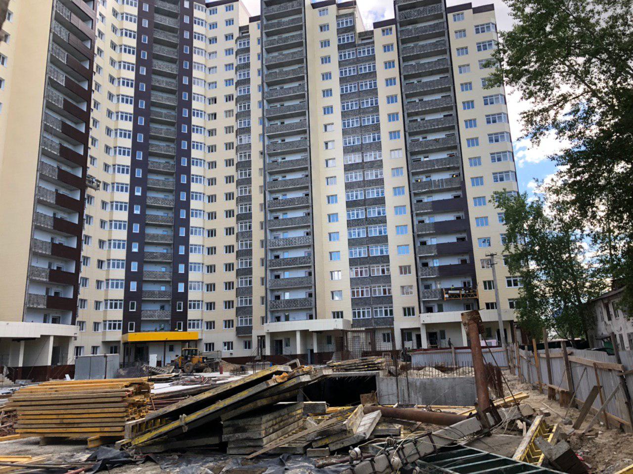 Рабочие в количестве 4 человек ведут отделку фасада, облицовку балконов общего пользования (на люльках). У подъездов ведутся работы силами порядка 4-6 человек, производится отделка помещений общего пользования. Работает погрузчик со стороны дороги.