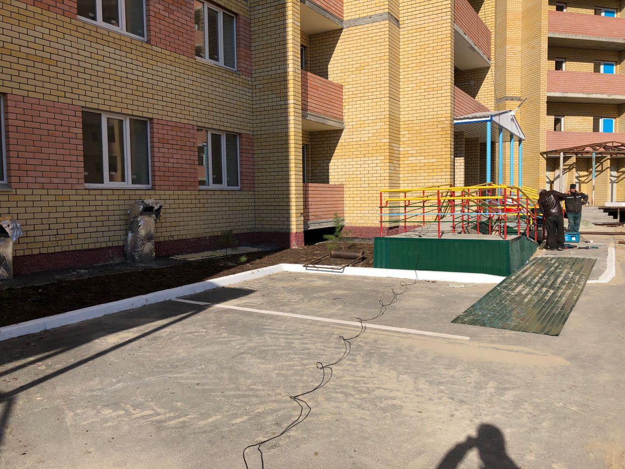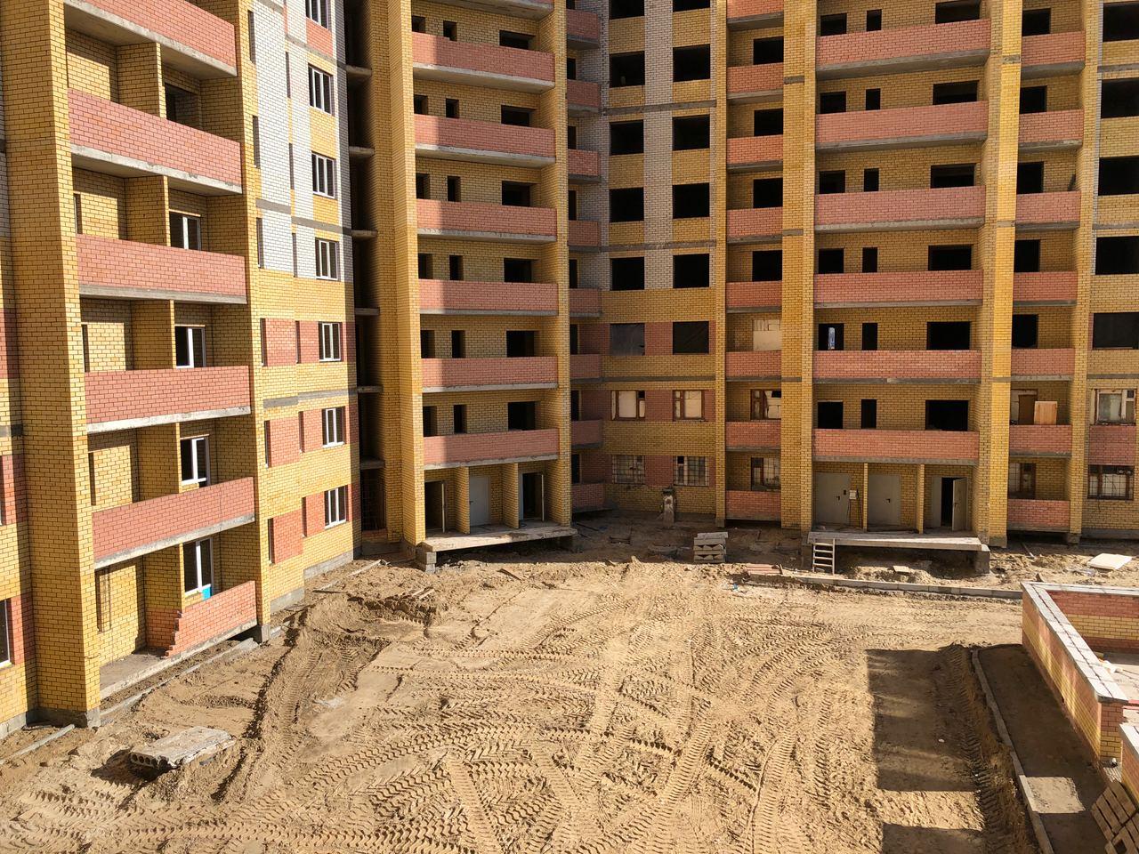 На строительной площадке первых четырех подъездов находятся ориентировочно 10-15 рабочих.