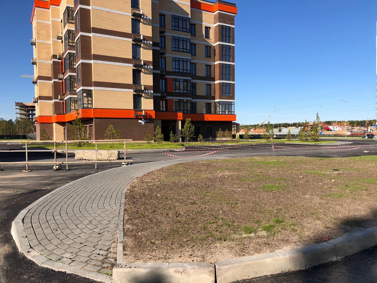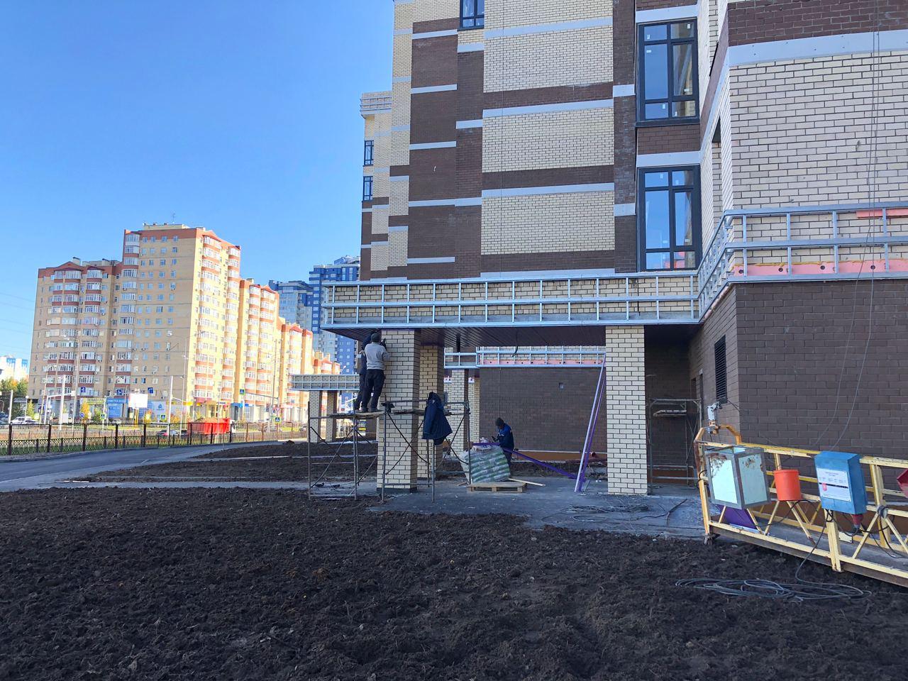 Производятся работы по работы по монтажу фасада, благоустройству территории, асфальтированию тротуаров.