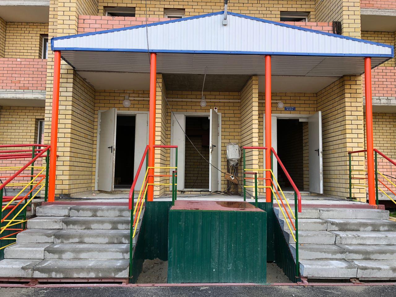 В четвертом подъезде работы не ведутся, двери открыты. На крыльце 2 рабочих ведут укладку напольной плитки.