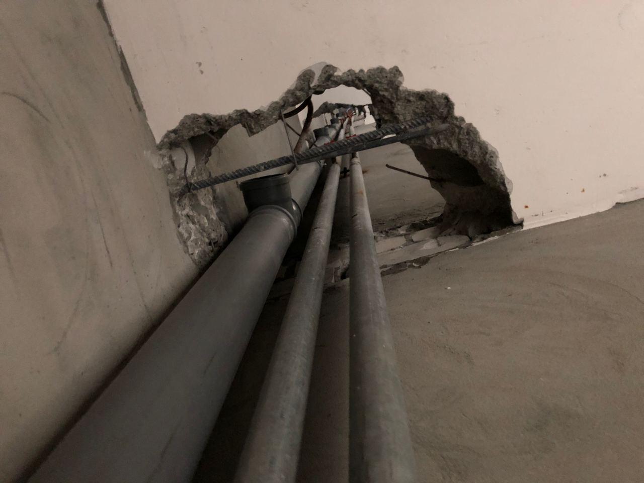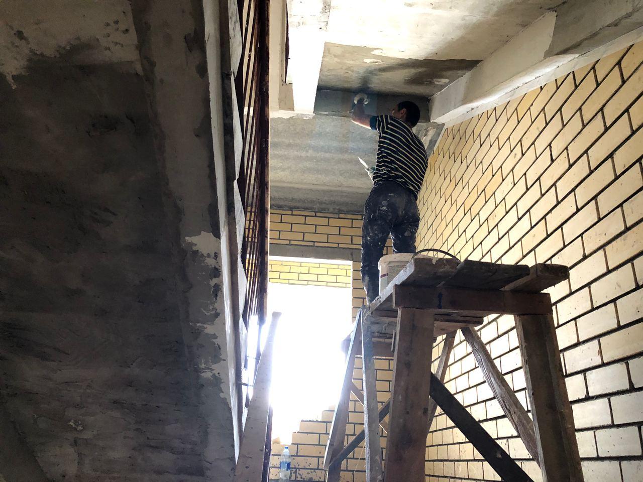 В третьем подъезде ведутся работы по заделке отверстий вокруг стояков водоснабжения и канализации в квартирах в перекрытии шестого этажа, смонтирована «опалубка». Электрики проводят пусконаладочные работы освещения. 2 шуткатура-маляра производят отделочные работы на лестничной клетке.