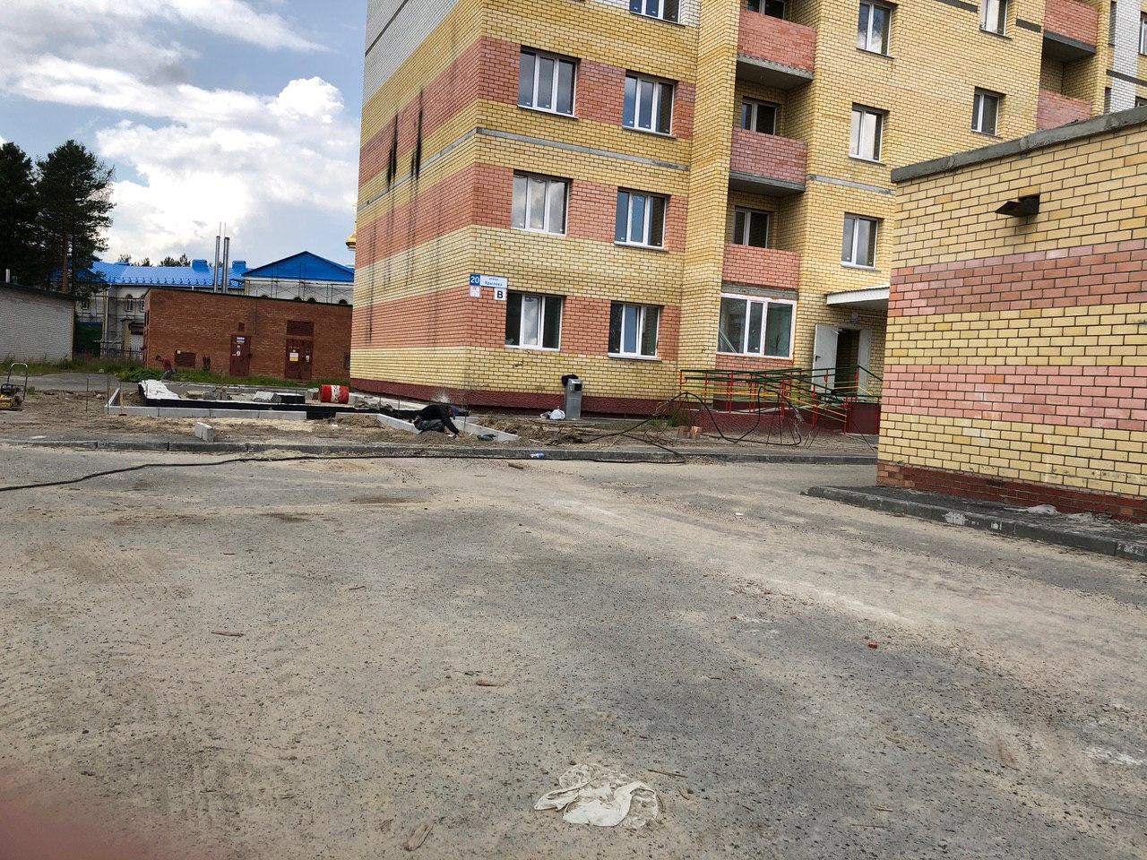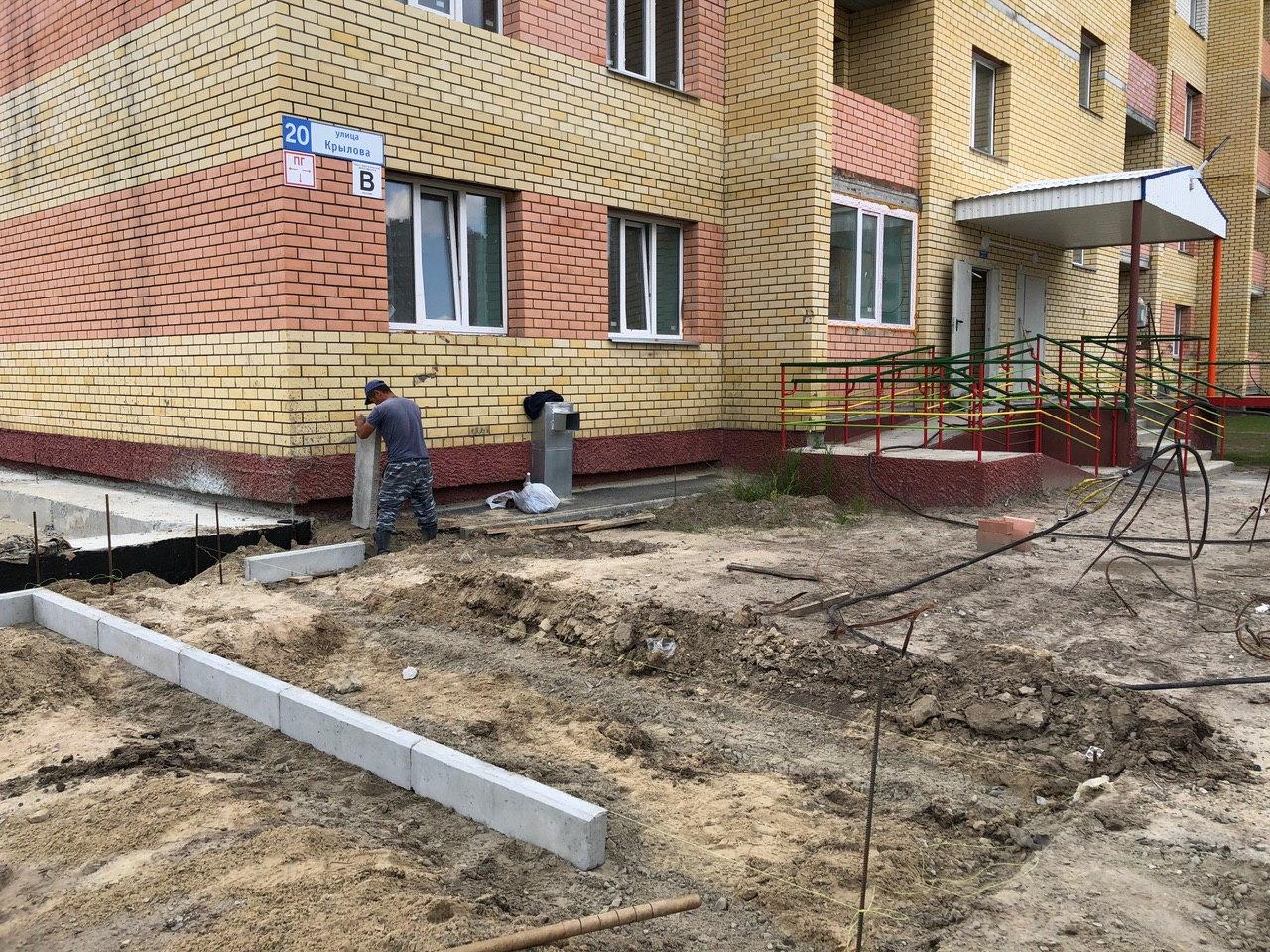 2 работниками ведутся работы по установке бордюрного камня вокруг объекта: «Здание приема посетителей по вопросам предоставления коммунальных услуг», входящего в 4 этап строительства.