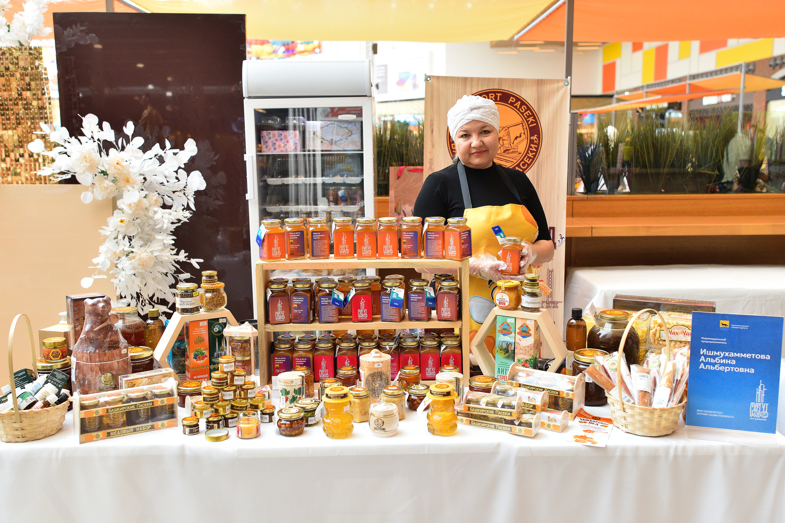 Местные товаропроизводители и предприятия общественного питания города Сургута предложили продукцию собственного производства — хлебобулочные, кондитерские, мясные и рыбные изделия, мёд, растительные масла, чаи, прохладительные напитки.