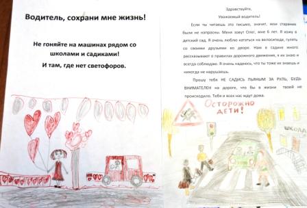 А пока взрослые участники акции «Водитель, сохрани мне жизнь!» общались с автоинспектором, дети нарисовали рисунки на дорожную тематику – письма-обращения к водителям, в которых они отразили свои просьбы о том, чтобы все водители соблюдали Правила дорожного движения и главное – обратили особое внимание на детскую дорожную безопасность. Рисунки у ребят получились очень яркие и необыкновенно красивые. Все эти письма-обращения были подписаны тематическими лозунгами с призывом водителей к безопасности дорожного движения. В дальнейшем, рисунки с лозунгом «Водитель, сохрани мне жизнь!» разместятся на постоянно действующем информационном стенде по безопасности дорожного движения в здании сургутской Госавтоинспекции, с информацией которого может ознакомиться каждый посетитель Госавтоинспекции. В конце мероприятия все участники обменялись благодарностями, дети группы «Антошка» приняли от сотрудников Госавтоинспекции памятные подарки, а педагоги и родители воспитанников благодарности от имени руководства ГИБДД.