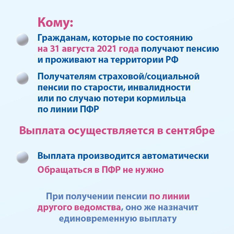 Все пенсионеры, проживающие в Российской Федерации, которые по состоянию на 31 августа 2021 года получают страховые пенсии или пенсии по государственному пенсионному обеспечению. Иными словами, единовременная выплата полагается всем проживающим в РФ пенсионерам, получающим пенсии от Пенсионного фонда России.