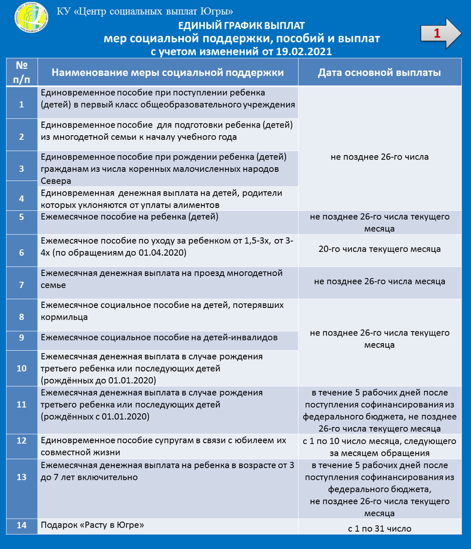 Единый график выплат мер социальной поддержки, пособий и выплат с учетом изменений от 19.02.2021