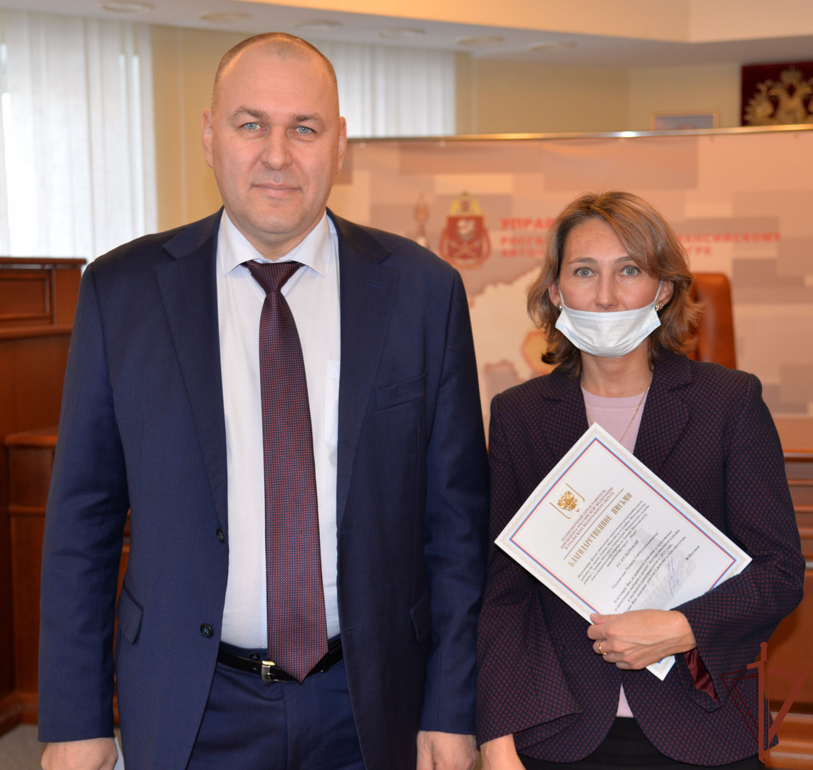 Инспектору фонда отделения лицензионно-разрешительной работы по г. Ханты-Мансийску и Ханты-Мансийскому району территориального управления Росгвардии Рамиле Пузыревой благодарственное письмо вручил главный федеральный инспектор по Ханты-Мансийскому автономному округу – Югре аппарата полномочного представителя Президента Российской Федерации в Уральском федеральном округе Александр Постников.