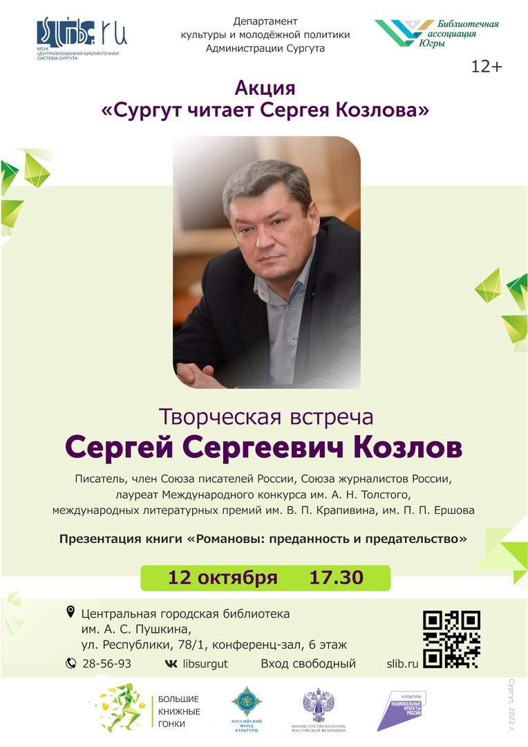 12 октября, в 17.30, в конференц-зале Центральной городской библиотеки им. А. С. Пушкина состоится творческая встреча с писателем Сергеем Сергеевичем Козловым. Автор книг «Романовы. Преданность и предательство», «Мальчик без шпаги», «Первозванный (ангелы плачут)» и других произведений выступит перед горожанами в рамках литературной акции «Сургут читает Сергея Козлова».