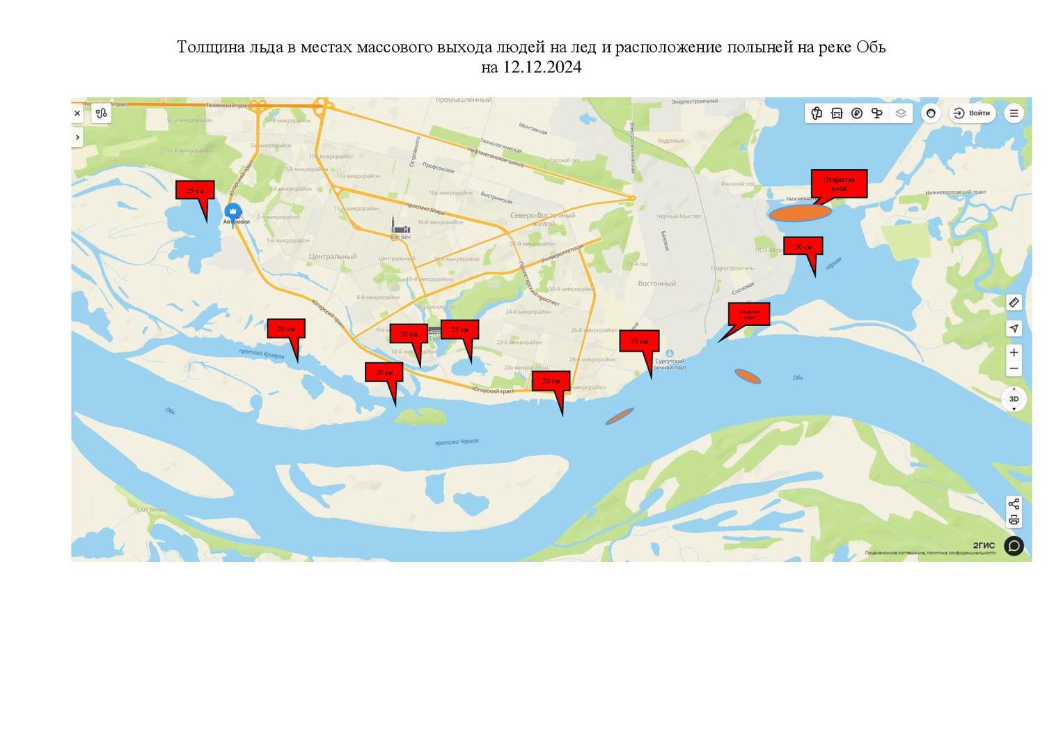 Толщина льда в местах массового выхода людей на лед по состоянию на 12.12.2024 составляет: