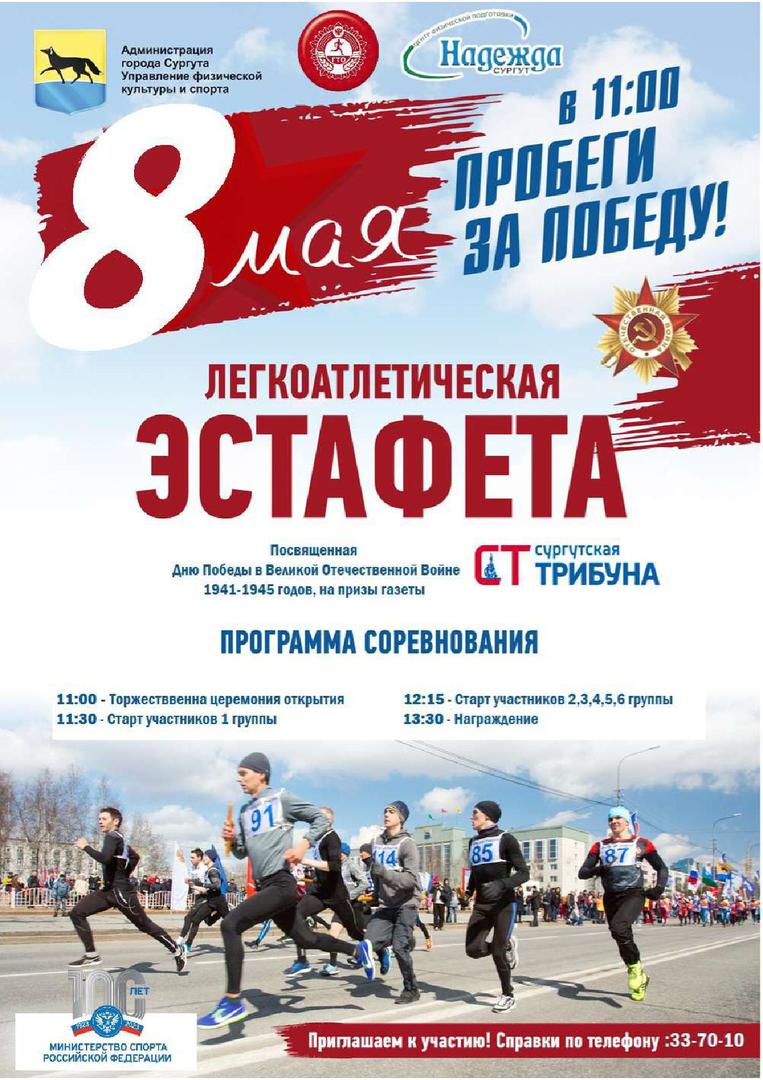 В этом году традиционная легкоатлетическая эстафета на призы газеты «Сургутская трибуна», посвященная Дню Победы в Великой Отечественной войне 1941-45 годов, состоится 08 мая.