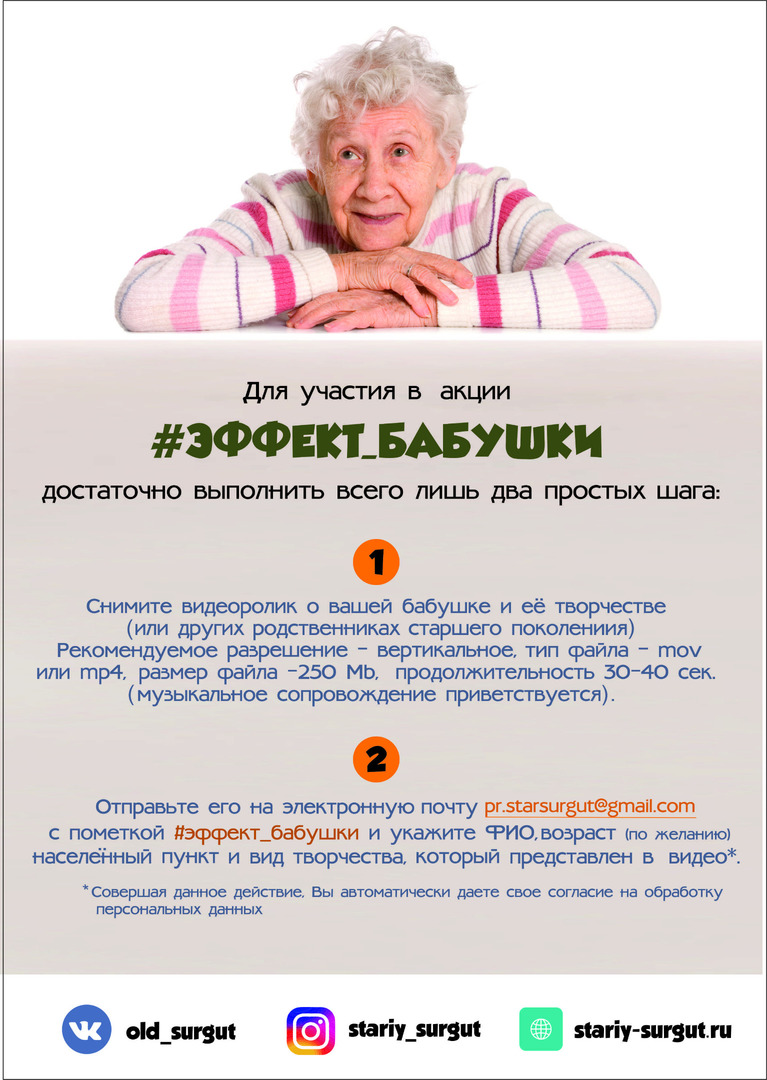 - Отправить его на электронную почту pr.starsurgut@gmail.com с пометкой #Эффект_бабушки и укажите ФИО, возраст (по желанию), и вид творчества, который представлен в видео*.