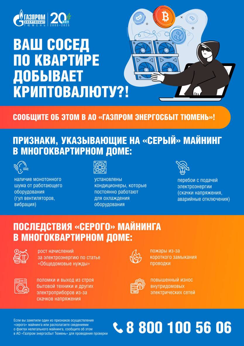 В случае выявления признаков майнинга гражданам рекомендуется незамедлительно обратиться в АО «Газпром энергосбыт Тюмень» по номеру телефона 8 (800) 100-56-06.