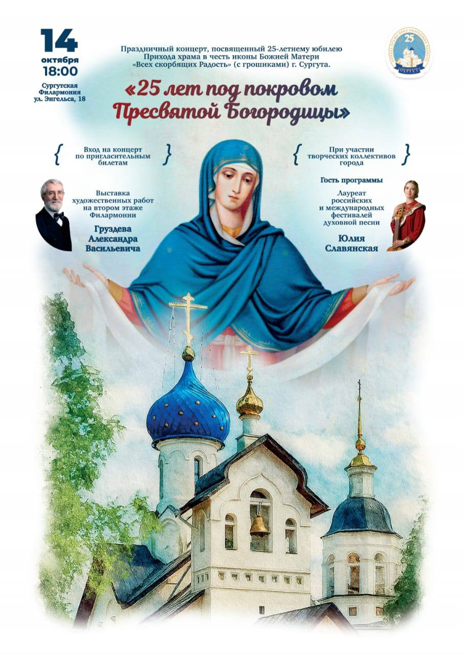 14 октября 2025 года в 18.00 часов в большом концертном зале МАУ «Сургутская филармония» (ул. Энгельса, 18) состоится торжественное мероприятие, посвященное 25-летию Храма «Всех скорбящих Радость» (с грошиками). Вход по пригласительным (билеты в кассе МАУ «Сургутская филармония», ул. Энгельса, 18. Режим работы: 09.00-20.00 обед 14.00-14.40).
