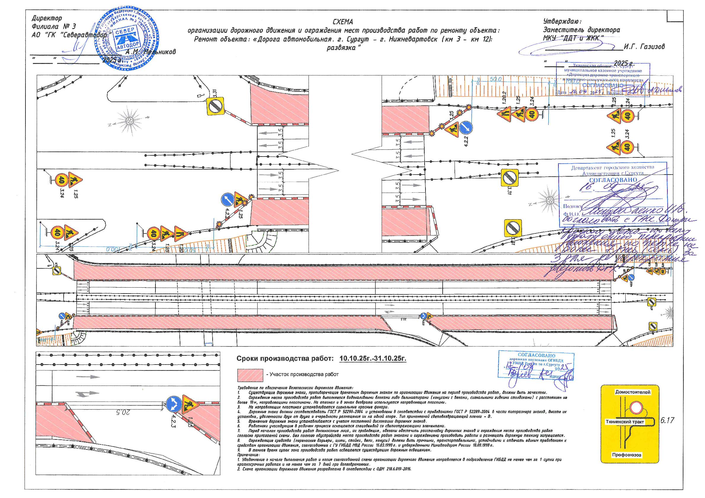 В рамках производства ремонтных работ по объекту «Дорога автомобильная г. Сургут – г. Нижневартовск (км 3 – км 12): развязка», будет ограничено движение автотранспорта по автомобильной дороге г. Сургут – г. Нижневартовск (км 3 – км 12) с 09.00 часов 21.10.2025 до 21.00 часа 31.10.2025.