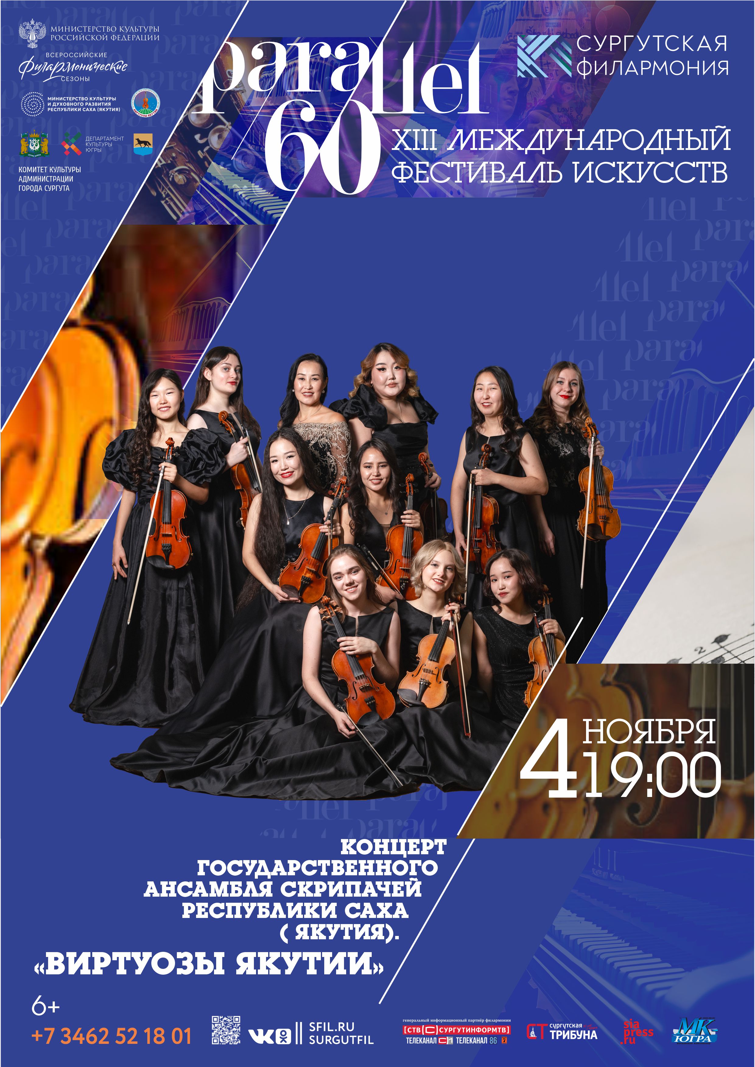 4 ноября в 19.00 в Большом концертном зале Сургутской филармонии (ул. Энгельса, 18) состоится концерт Государственного ансамбля скрипачей Республики Саха (Якутия) «Виртуозы Якутии» в рамках XIII Международного фестиваля искусств «60 параллель».