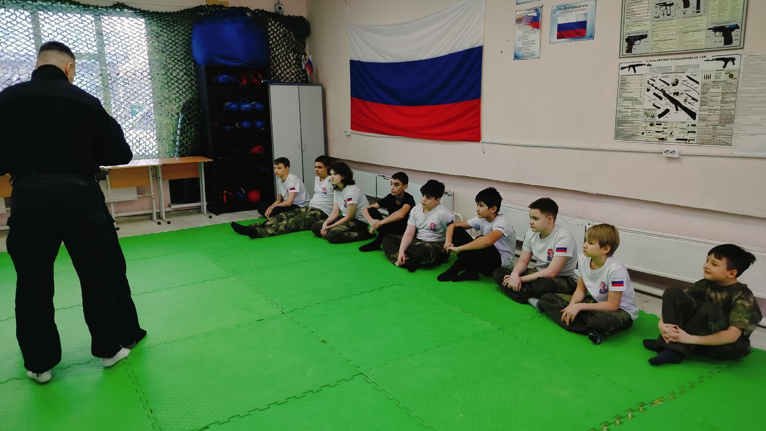 В рамках всероссийской акции «Дни Росгвардии», посвященной 215-й годовщине создания войск правопорядка и 10-летию Федеральной службы войск национальной гвардии Российской Федерации сотрудники ОМОН «Сокол-Югра» Управления Росгвардии по ХМАО — Югре провели для воспитанников детско-юношеского военно-патриотического общественного движения «Гвардейская смена» первое в этом году занятие по начальной военной подготовке. После утренней разминки инструкторы — участники специальной военной операции — отработали с курсантами приемы самообороны и рукопашного боя.