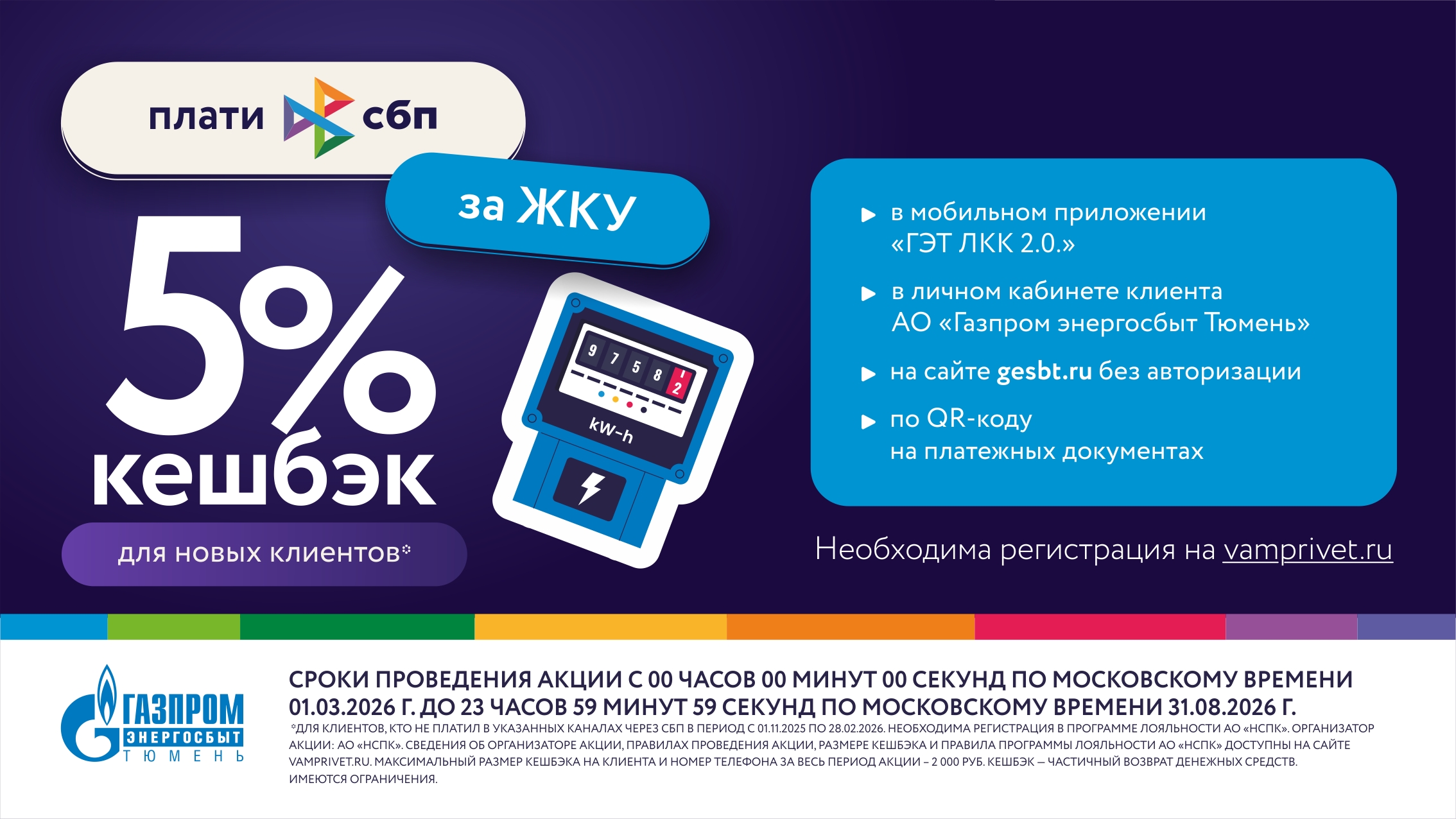 Перед оплатой необходимо зарегистрироваться в Программе лояльности АО «НСПК» на vamprivet.ru указав номер телефона, с которого планируете оплачивать услуги в рамках акции по СБП. Максимальный размер кешбэка за весь период акции – 2 000 рублей (на клиента и номер телефона). Подробные условия акция доступны по ссылке – https://gesbt.ru/o-kompanii/aktsii/.