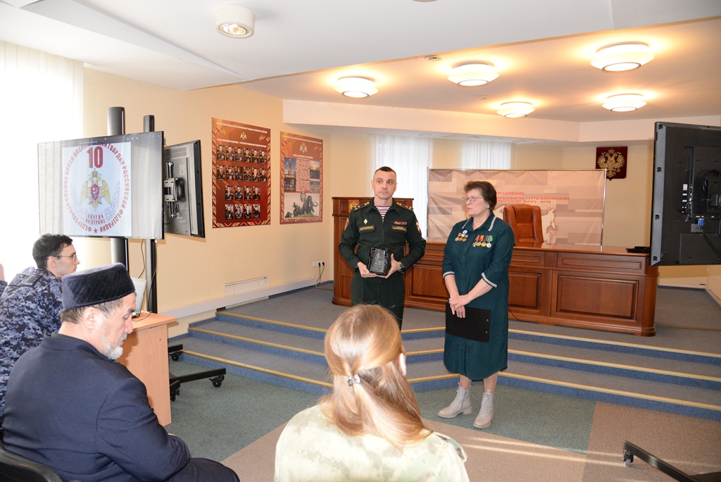 От имени Совета ветеранов Всероссиийской общественной организации ветеранов ХМАО – Югры Татьяна Тихон передала в музейную экспозицию теруправления Росгвардии юбилейную памятную статуэтку «80 лет Победы над милитаристской Японией и окончания Второй мировой войны».