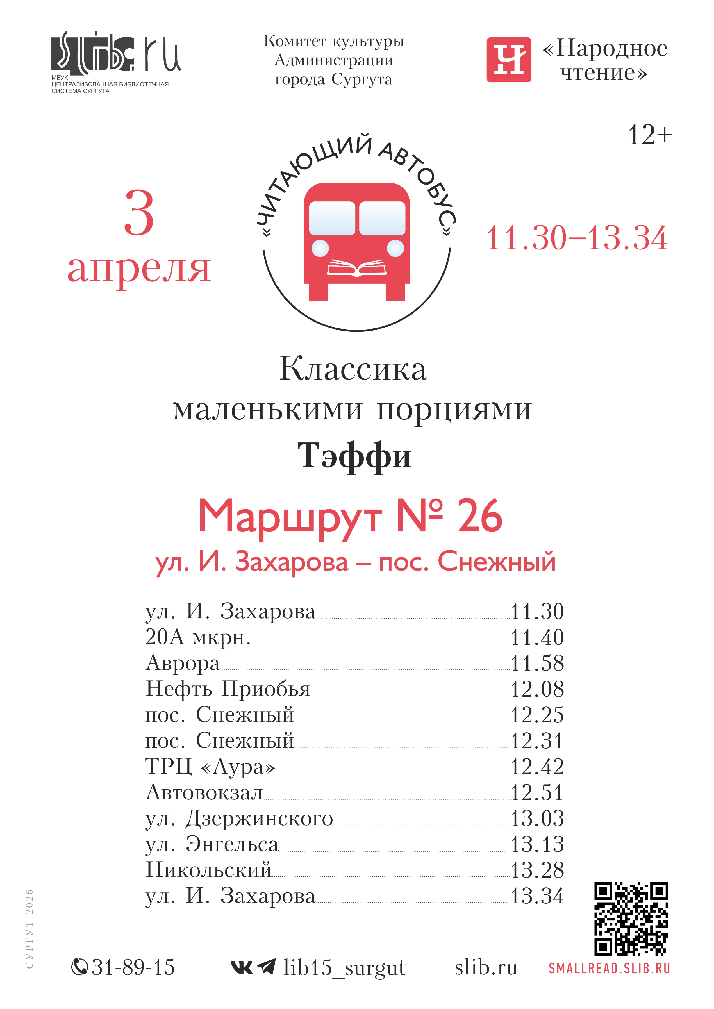 3 апреля в 11:30 от остановки «Ивана Захарова» начнет свое движение «Читающий автобус». Участниками апрельской акции могут стать пассажиры одного из автобусных маршрутов № 26. Во время проведения мероприятия сургутян и гостей города приглашают погрузиться в мир сатирической прозы и познакомиться с биографией и творчеством Тэффи (Надежда Александровна Лохвицкая), выдающейся русской писательницы, поэтессы и «королевы» русского юмора начала XX века.