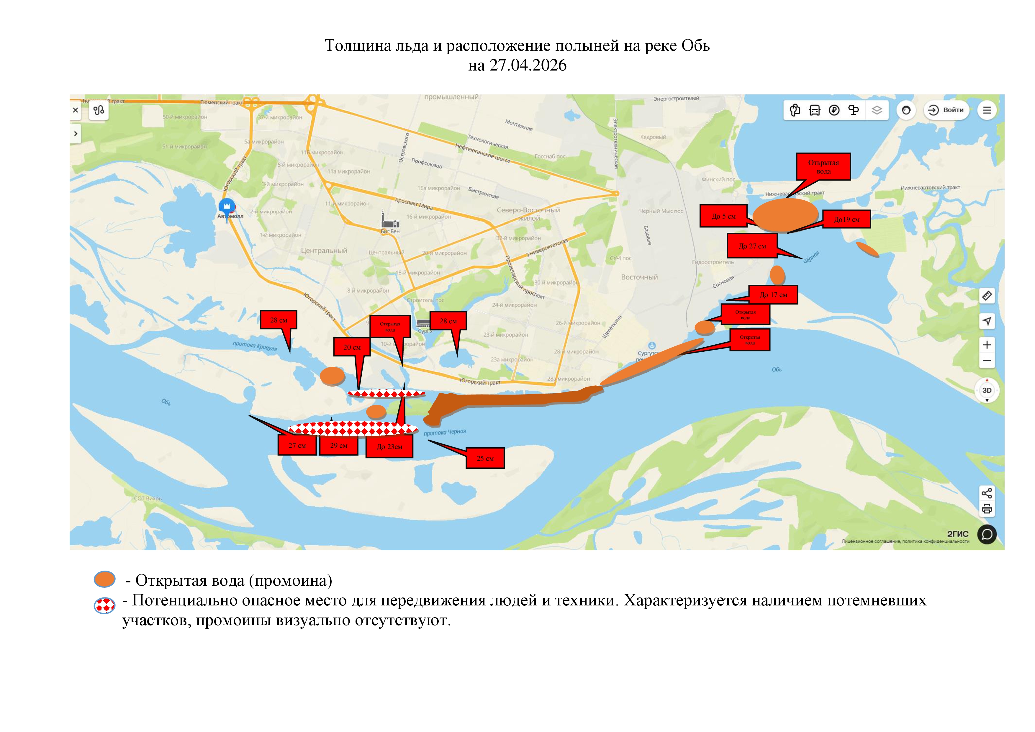 Толщина льда в местах выхода людей на лед по состоянию на 28.04.2026 составляет: