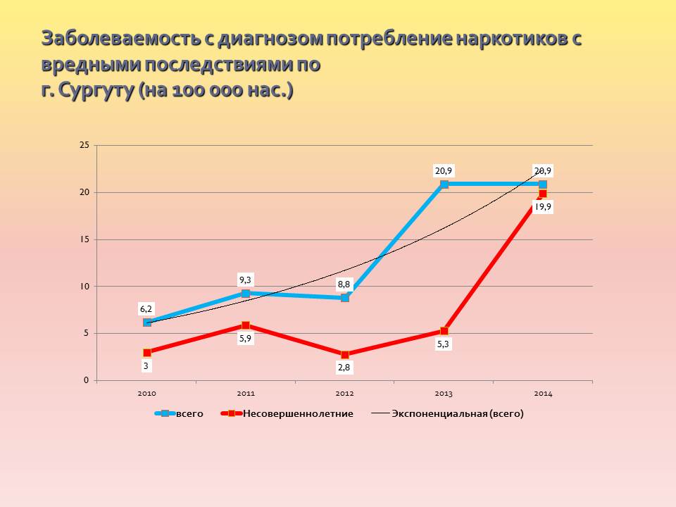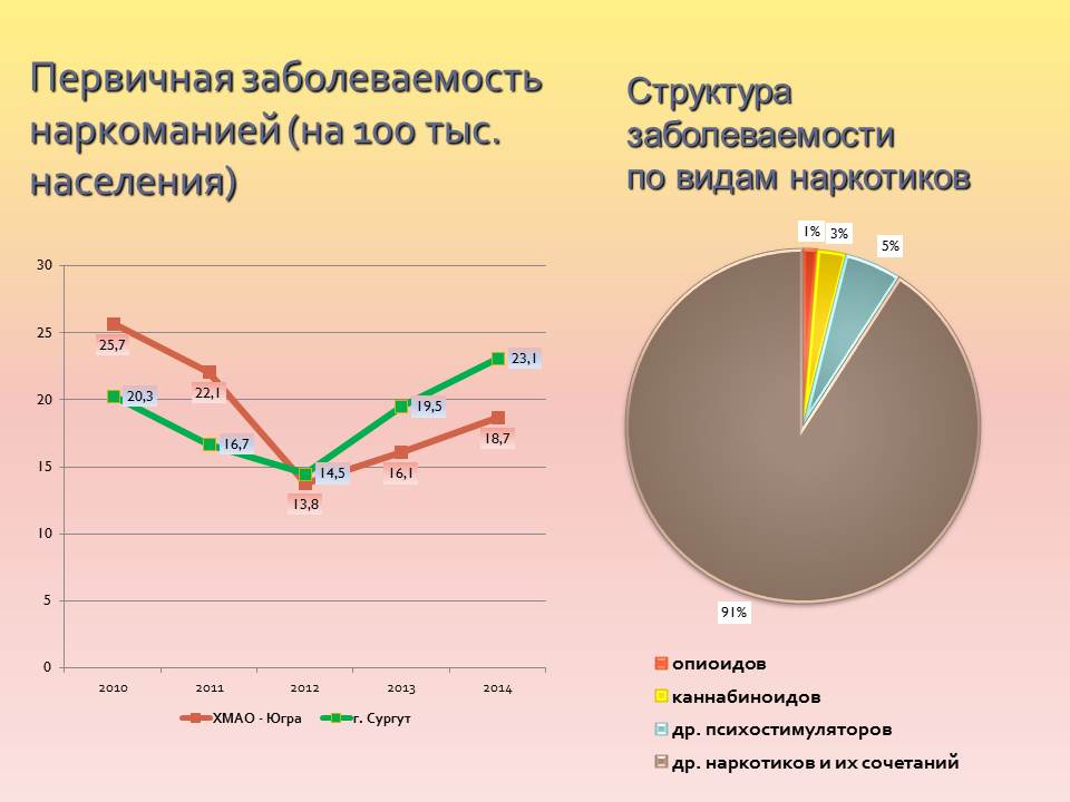 В течение 2014 года по г. Сургуту впервые зарегистрировано 76 наркозависимых. Из них 69 человекам диагноз выставлен вследствие потребления «других наркотиков и их сочетаний» (90,8 %); других психостимуляторов – 4 человека, каннабиноидов – 2 человека, опиоидов – 1 чел. Первичная заболеваемость наркоманией в 2014 году составила 23,1 на 100 тыс. населения, что на 18,5% выше уровня 2013 года (19,5 на 100 тыс. населения). Этот показатель также превышает средний по РФ за 2013 год (13,9%), но ниже показателя Уральского Федерального округа (24,4 на 100 тыс. населения). Таким образом, прирост состоящих на учете наркозависимых в 2014 по сравнению с предыдущим составил 18,8 %. Рост произошел, главным образом, за счет потребителей и распространения синтетических наркотических средств.
