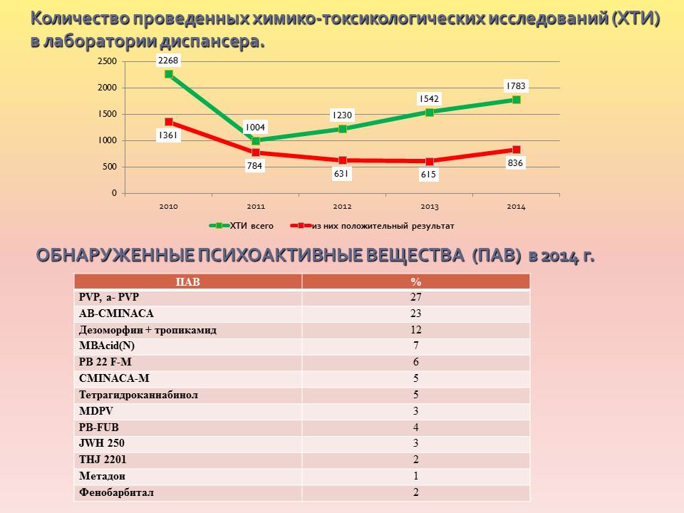 - функционирует клинико-диагностическая лаборатория, укомплектованная хроматографами для проведения химико-токсикологических исследований на предмет содержания наркотических средств и психотропных веществ в биологических средах организма; за 2014 год произведено 1783 химико-токсикологических исследований на предмет содержания в биологических пробах наркотических и психотропных веществ. В 836 случаях результаты исследований анализов имели положительный характер.