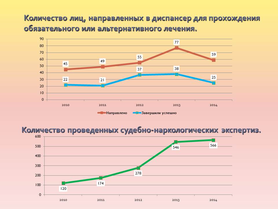 Ведение пациентов с наркотической зависимостью, направленных для прохождения обязательного и альтернативного лечения, в нашем учреждении осуществляется в соответствии: с методическими рекомендациями «Организация лечения и медико-социальной реабилитации больных наркоманией, совершивших преступление небольшой тяжести и получивших отсрочку отбывания наказания», подготовленные ФГБУ «Государственный научный центр социальной и судебной психиатрии имени В. П. Сербского» Минздрава России и ФГБУ «Национальный научный центр наркологии» Минздрава России и Приказом Департамента здравоохранения ХМАО – Югры № 1245 от 10.12.2014 «Об организации лечения и медико-социальной реабилитации больных наркоманией, совершивших нетяжелое преступление и получивших отсрочку отбывания наказания». Так, в 2014 году в нашем учреждении организован отдельный кабинет для наблюдения и лечения пациентов, которым по решению суда назначено обязательное или альтернативное лечение по поводу наркотической зависимости. За 2014 год по г. Сургуту обратилось 59 таких граждан. Из них 25 человек благополучно прошли курс лечения, 8 – продолжают терапию, остальные прервали лечение по разным причинам.