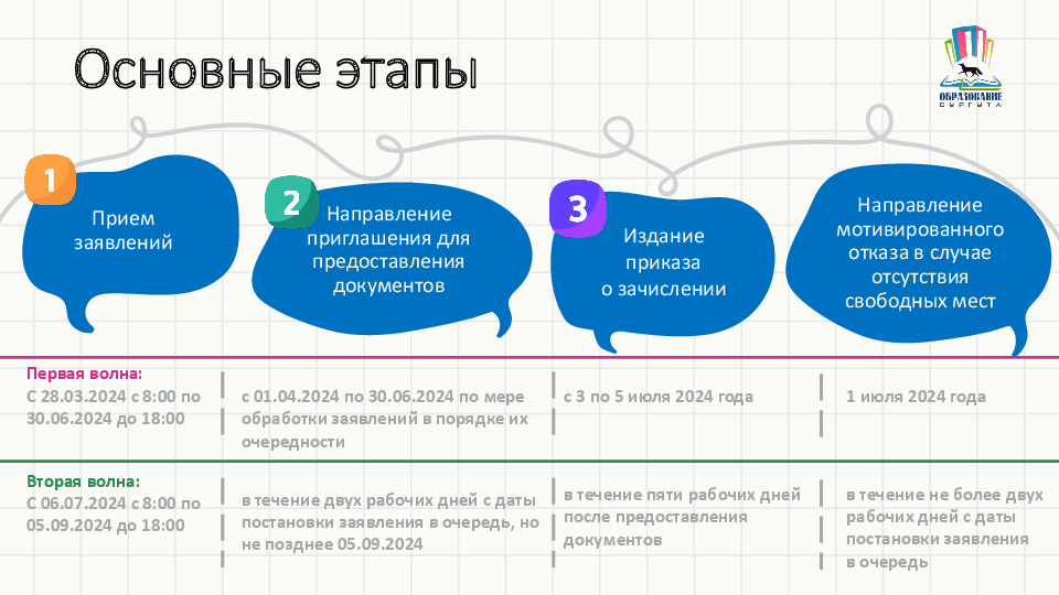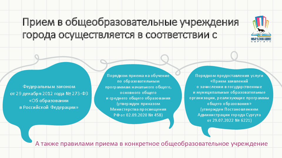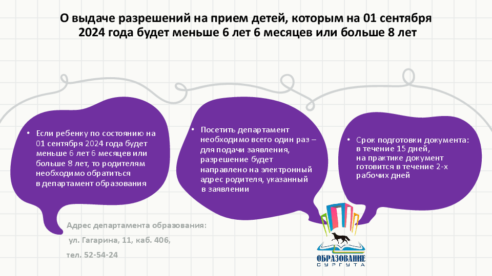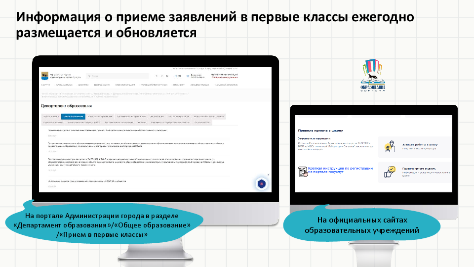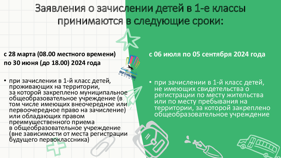 28 марта 2024 года в 8.00 в муниципальных общеобразовательных учреждениях начинается прием заявлений о зачислении в первый класс на 2024/25 учебный год. Предлагаем родителям будущих первоклассников ознакомиться с информацией о порядке приема и рассмотрения заявлений, подготовленной департаментом образования Администрации города.