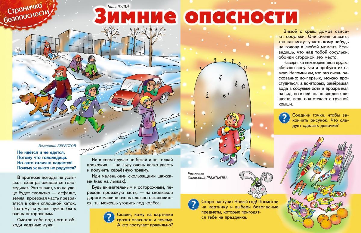 Ежегодно в декабре-феврале увеличивается вероятность дорожных происшествий с участием несовершеннолетних по причинам скатывания детей и подростков с горок и наледей на проезжую часть, использования придорожных снежных валов для игр. В зимний период времени категорически запретите детям кататься с горок вблизи дорог даже внутри дворовых территорий. Не позволяйте детям кататься с таких горок, даже если она заканчивается, по вашему мнению, далеко от дороги. Погодные условия меняются ежедневно, горки могут подтаять, а потом вновь замерзнуть и стать более скользкими, и санки «улетят» дальше, чем нужно. Детская одежда должна быть яркой или иметь светоотражающую полосу и желательно без больших капюшонов, ограничивающих поле зрения. Обувь должна иметь нескользкую, ребристую подошву. Дошкольник зимой должен гулять только в сопровождении взрослых людей.