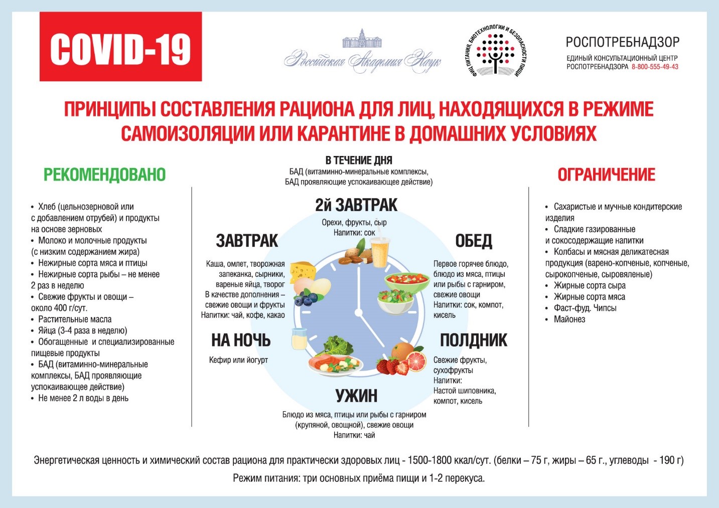 Федеральный исследовательский центр питания, биотехнологии и безопасности пищи разработал принципы рациона для лиц, находящихся в режиме самоизоляции или карантина в домашних условиях.