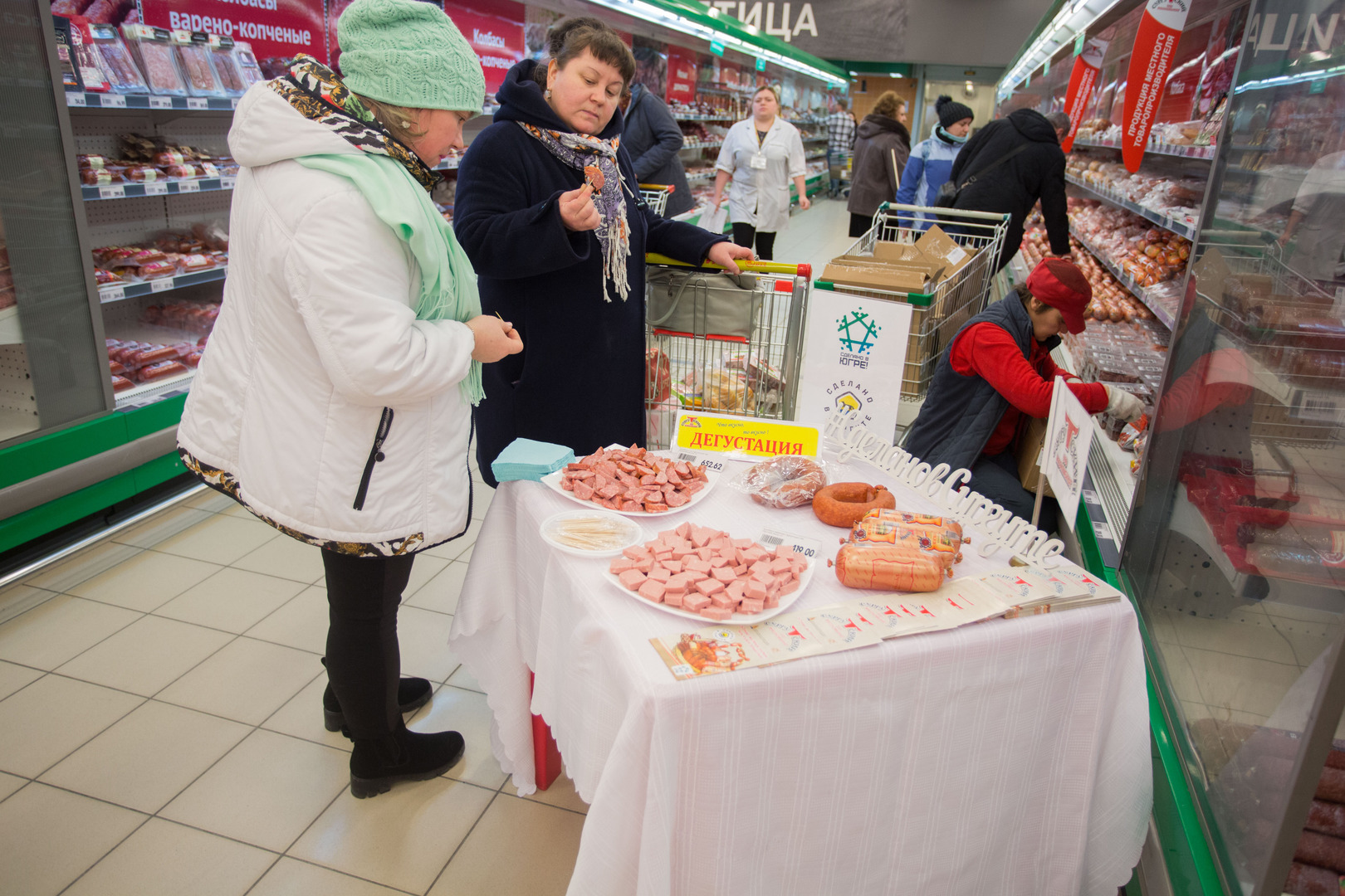Администрацией города, в рамках реализации проекта «Сделано в Сургуте», направленного на поддержку местных товаропроизводителей, проведен ряд рабочих встреч по взаимодействию местных товаропроизводителей с торговыми сетями муниципального образования городской округ город Сургут, по результатам которых достигнуты договоренности с федеральными торговыми сетями о проведении на их площадках дегустаций продукции сургутских товаропроизводителей.
