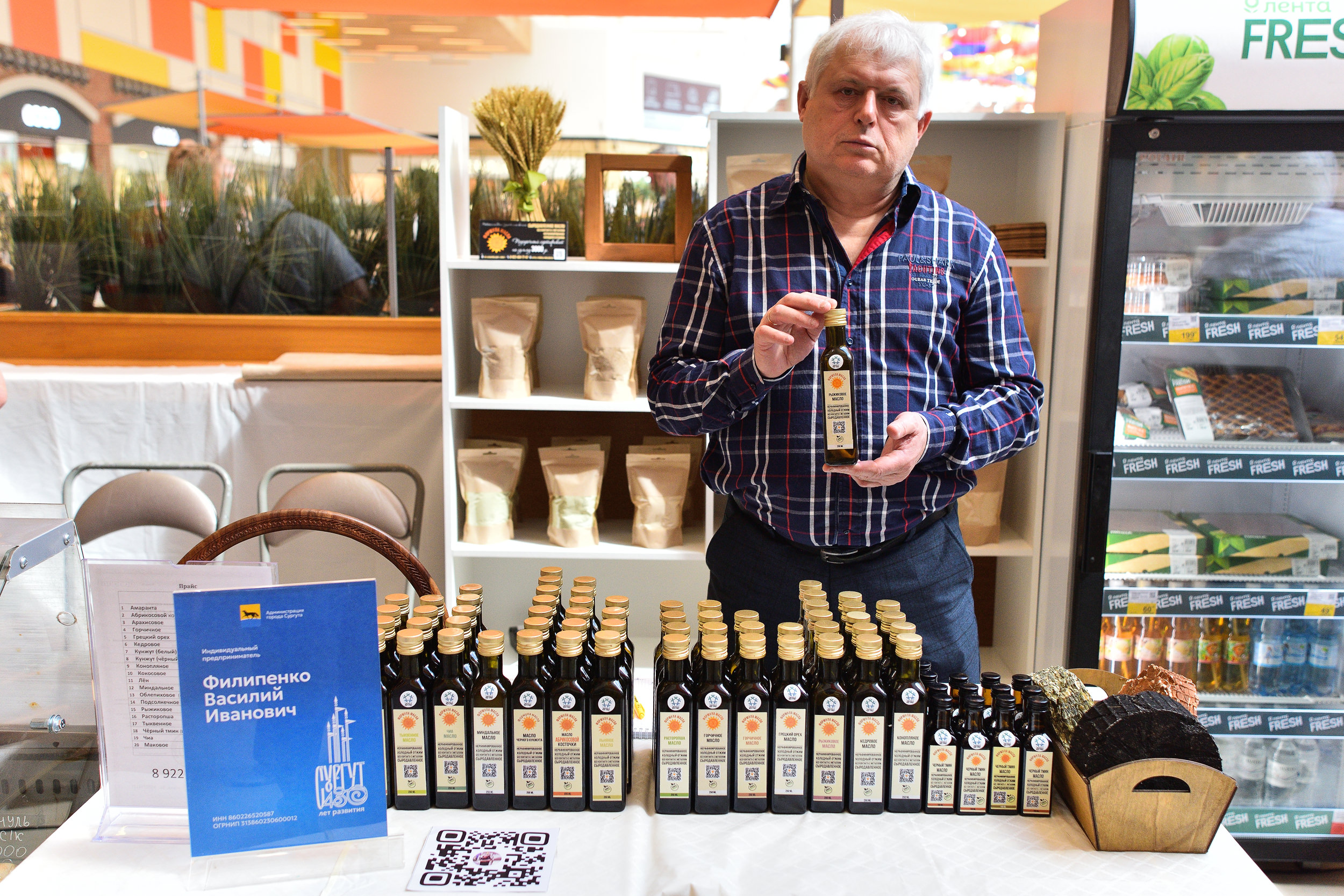 Местные товаропроизводители и предприятия общественного питания города Сургута предложили продукцию собственного производства — хлебобулочные, кондитерские, мясные и рыбные изделия, мёд, растительные масла, чаи, прохладительные напитки.