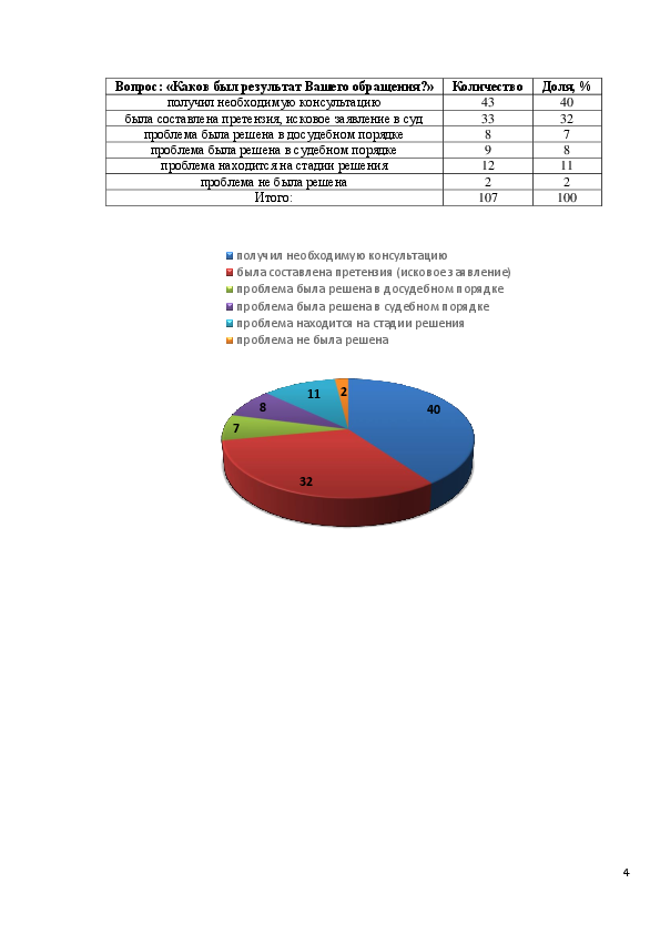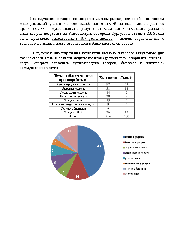 Для изучения ситуации на потребительском рынке, связанной с оказанием муниципальной услуги «Прием жалоб потребителей по вопросам защиты их прав», (далее – муниципальная услуга), отделом потребительского рынка и защиты прав потребителей Администрации города Сургута, в течение 2016 года было проведено анкетирование 107 респондентов – людей, обратившихся с вопросом по защите прав потребителей в Администрацию города.