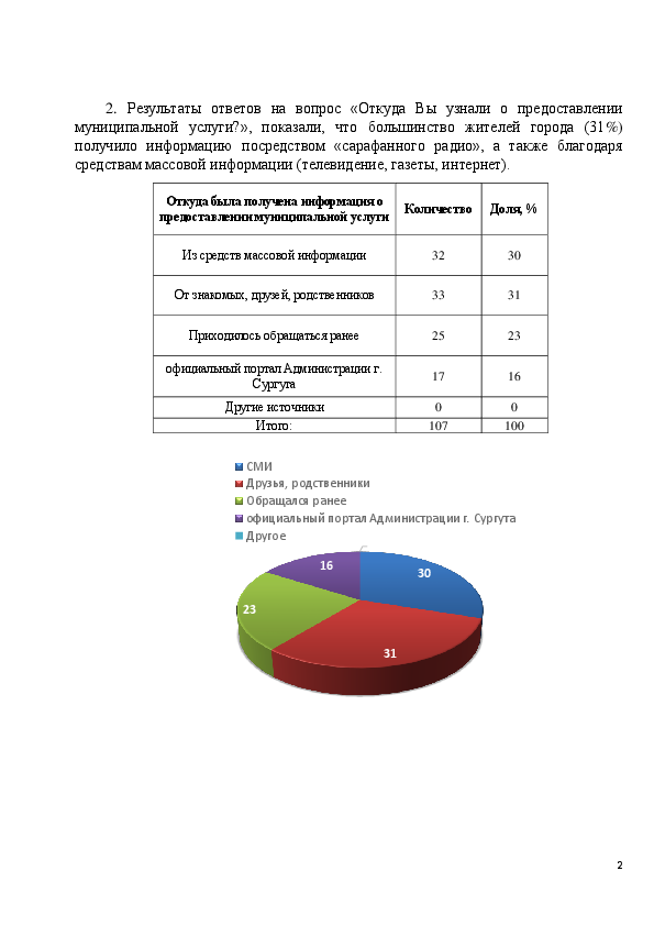 - Результаты ответов на вопрос «Откуда Вы узнали о предоставлении муниципальной услуги?», показали, что большинство жителей города (31%) получило информацию посредством «сарафанного радио», а также благодаря средствам массовой информации (телевидение, газеты, интернет).