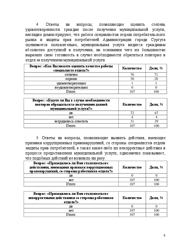 - Ответы на вопросы, позволяющие выявить действия, имеющие признаки коррупционных правонарушений, со стороны специалистов отдела защиты прав потребителей, а также какие-либо их некорректные действия в процессе предоставления муниципальной услуги, однозначно показывают, что подобных действий не возникло ни разу.