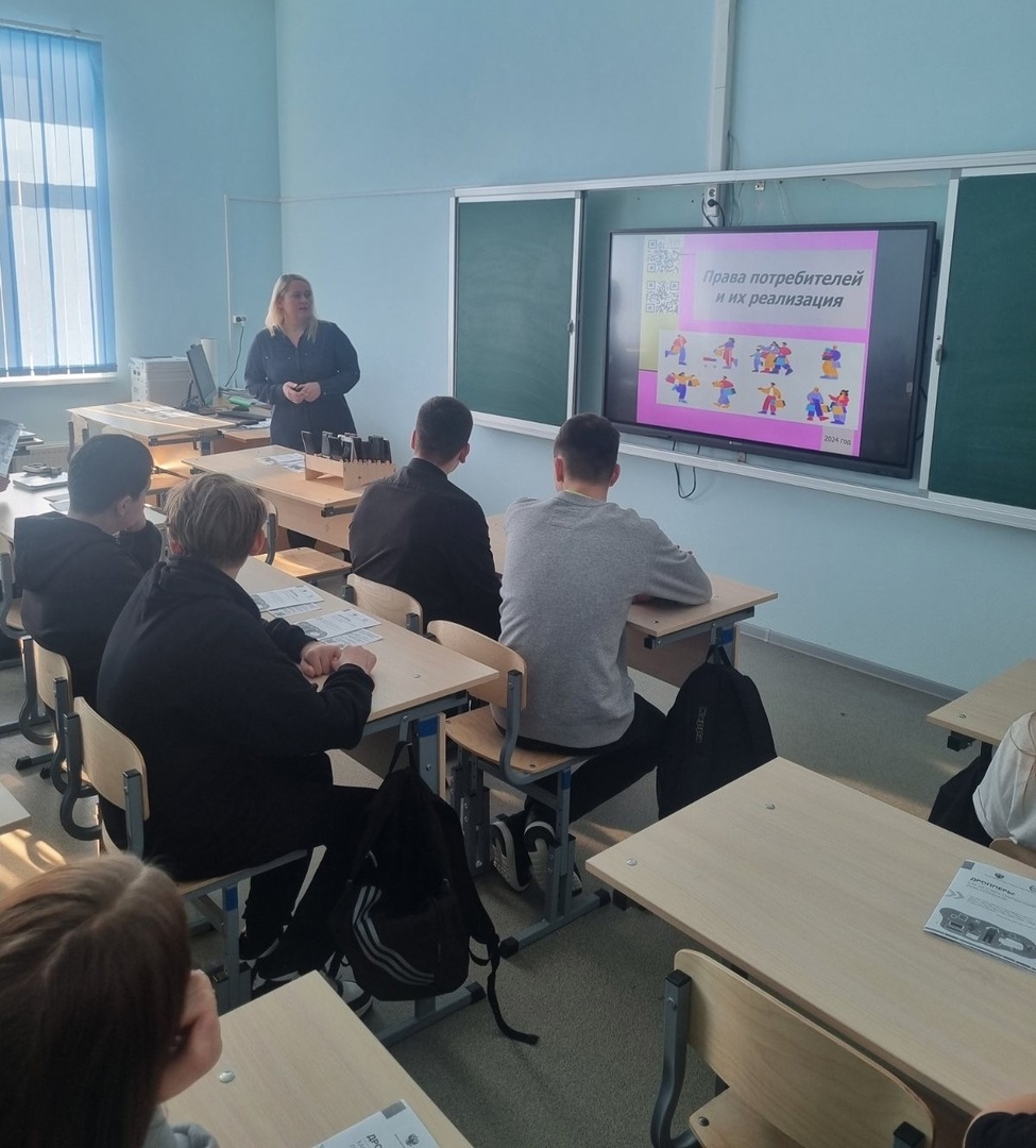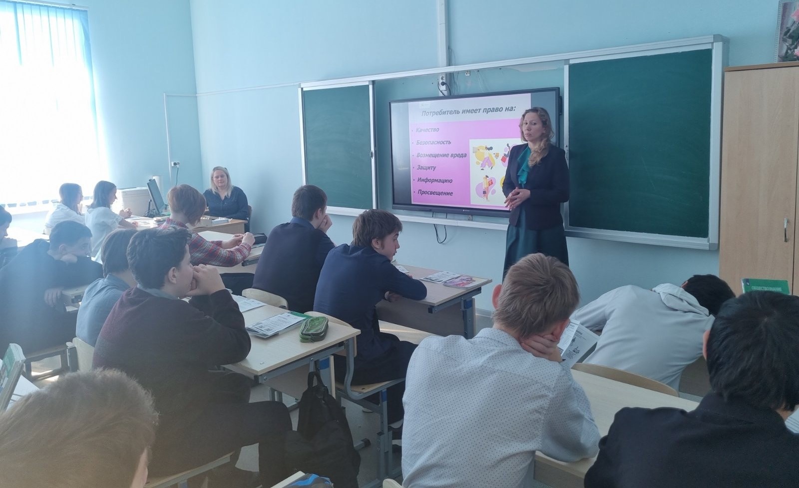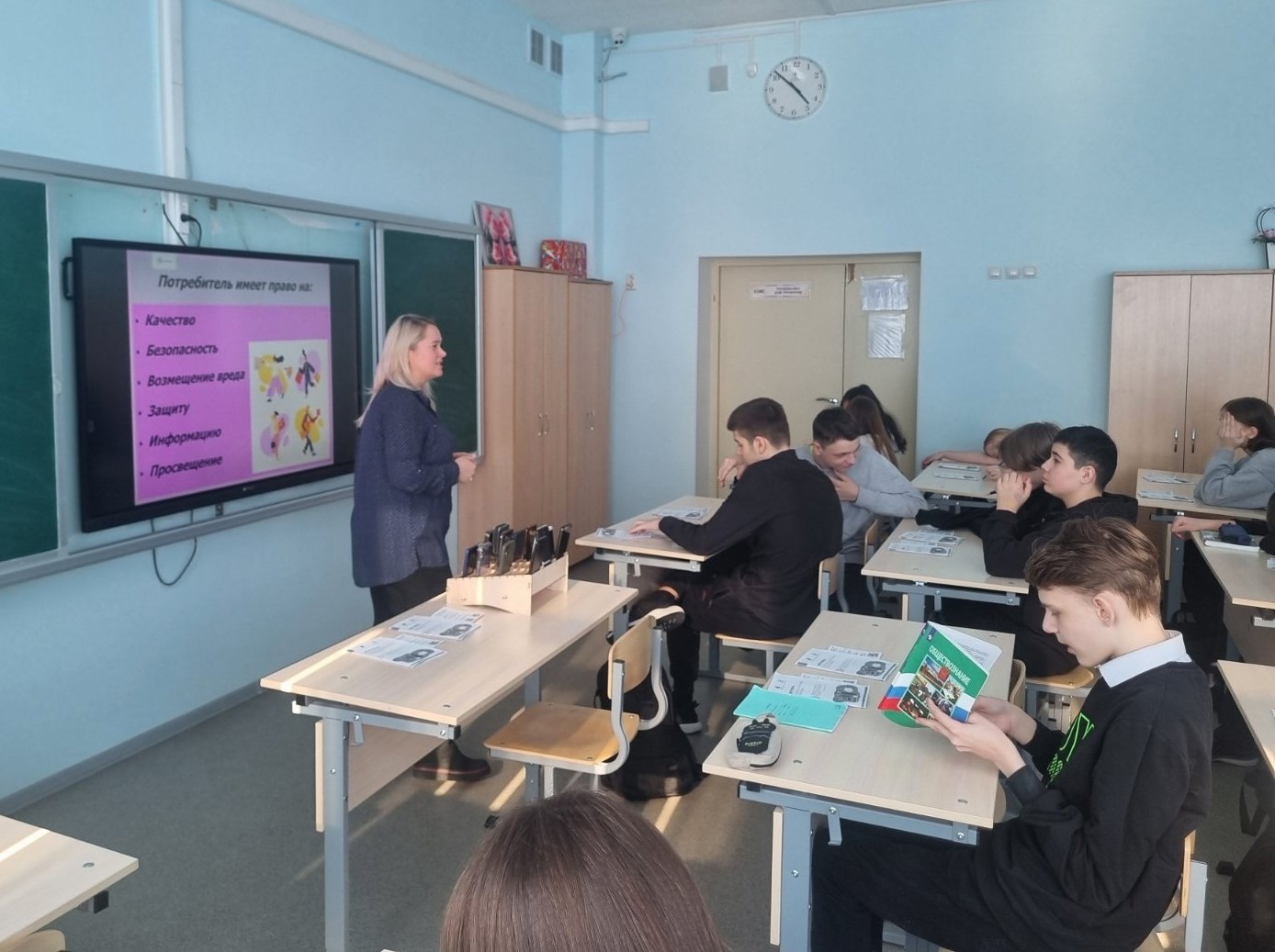 Ученики закрепили учебный материал по потребительской тематике, полученный на уроках обществознания, на реальных примерах из практики разобрали порядок защиты прав, сроки рассмотрения и удовлетворения претензий, особенности дистанционных покупок и множество других полезных вопросов. Были выделены основные права потребителей: право на выбор, право на информацию, право на просвещение, право потребителя при приобретении товара ненадлежащего качества, право на безопасность.