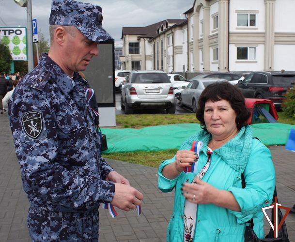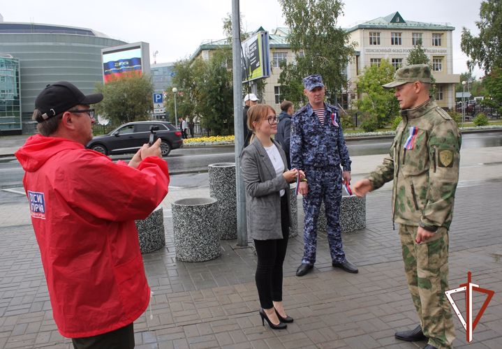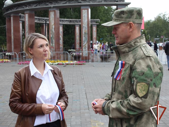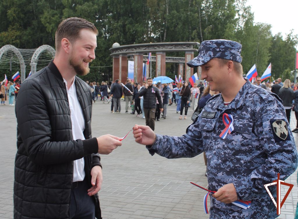 Традиционно во всех городах Югры росгвардейцы поздравляют югорчан с праздником, вручая им патриотический символ неразрывной связи гражданина со своей страной - ленточку с российским триколором.