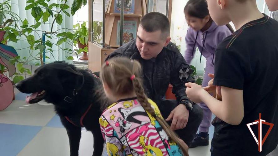 В детской библиотеке города Ханты-Мансийска инспектор-кинолог Управления Росгвардии по ХМАО – Югре прапорщик полиции Артур Нугманов вместе со служебной собакой по кличке Лорд встретился с учащимися школ города. Минно-розыскная овчарка продемонстрировала свои навыки в поиске опасных предметов. Кинолог Росгвардии рассказал ребятам об обучении и ежедневных тренировках с собакой, а также о своей службе в ведомстве.