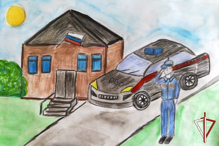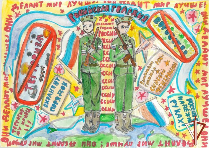 Так, Зайнутдинов Роман в своей работе отобразил военнослужащих Росгвардии с триколором, стоящих на страже правопорядка и безопасности в стране.