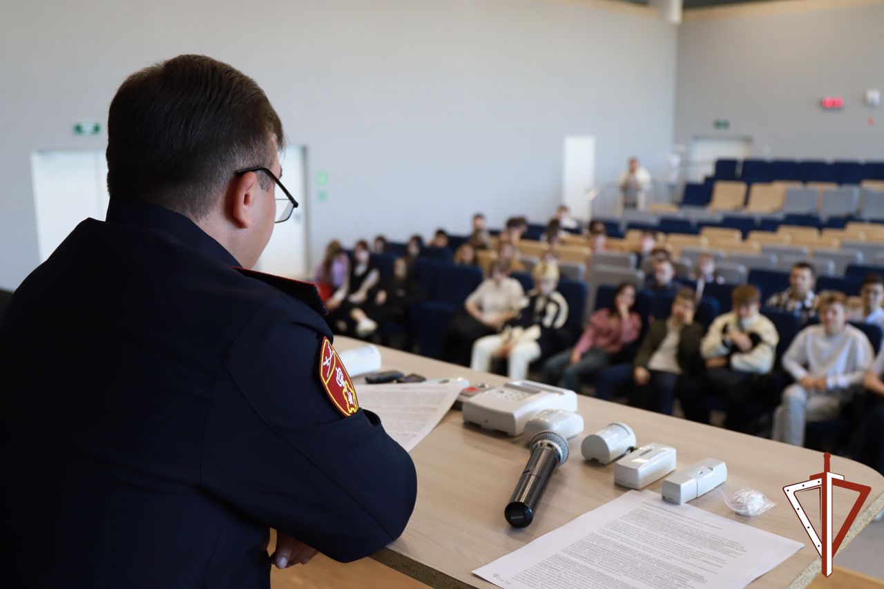 В Ханты-Мансийске в рамках всероссийской акции «Лицом к лицу» старший инженер отдела организации, внедрения и эксплуатации инженерно-технических средств охраны и безопасности Управления Росгвардии по ХМАО – Югре подполковник полиции Руслан Калеев провел внеклассное мероприятие для учащихся старших классов школы № 8.
