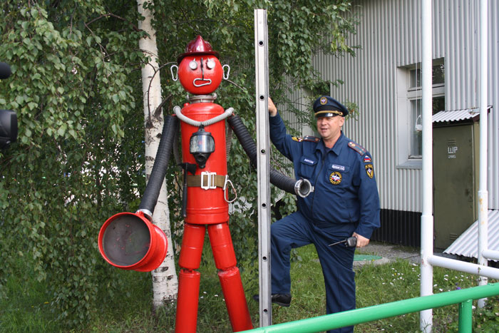 Чуть больше месяца назад на улице Пушкина возле 41 пожарной части 1 отряда федеральной противопожарной службы появилась необычная скульптура, которая сразу вызвала живой интерес у жителей и гостей города. Оригинальное, но в то же время специфичное исполнение никого из зевак не оставляет равнодушным! Чтобы узнать обо всех подробностях появления столь необычной для города скульптуры я отправилась в 41 пожарную часть. Как выяснилось, идея ее создания у брандмейстеров части возникла давно. А претворить в жизнь задумку помог недавний 45-летний юбилей Сургутского гарнизона пожарной охраны. Скульптура пожарного стала подарком от коллектива 41 части всем коллегам и жителям города. Рассказывает начальник 41 части 1 отряда федеральной противопожарной службы Александр Кривов: «Собирали мы нашего Паленого (прим. так назвали своего коллегу пожарные) всем миром, прямо в части. В ход пошли всевозможные предметы снаряжения пожарного, а также списанные огнетушители, всасывающие рукава, и даже фрагмент трехколенной лестницы. Есть у нашего Паленого каска, защитная маска и даже пояс с карабинами. Кстати, каску эту когда-то сделал своими руками ветеран пожарной охраны Михаил Вазгенович Аракелян. К сожалению, Михаила Вазгеновича уже нет в живых. Когда встал вопрос, что же надеть Паленому в качестве головного убора, мы сразу же вспомнили именно об этой каске. Идей было много, впрочем, как и составных частей. Нашего Паленого мы создавали прямо на асфальте перед частью, складывая его из подручных материалов. Как видите, пожарные 41 части не только профессионалы в своем деле, но и люди творческие. И то, что сургутян наш металлический коллега так заинтересовал, означает, что у нас неплохо получилось!» Надо отметить, что пожарник Паленый может служить не только украшением города, но и наглядным пособием для тех, кого интересует пожарное дело! Естественно, что выполнен он в красном цвете – если можно так сказать, в корпоративной пожарной окраске. Коллектив 41 пожарной части считает его не просто скульптурой, а своим 97-м по счету сотрудником. «Иногда приедешь с очередного пожара уставшим, посмотришь на него – и на душе как-то сразу легче становится!», - подчеркнул Александр Кривов. К сожалению, проблема вандализма не обошла и Паленого стороной. Буквально прошедшей ночью кто-то из хулиганов оторвал у статуи защитную маску! Но коллеги-пожарные сразу же нашли ей замену. Так что Паленый снова гордо стоит в полной боевой готовности – хоть сейчас на пожар отправляй! Если, конечно, вандалы вновь не атакуют!