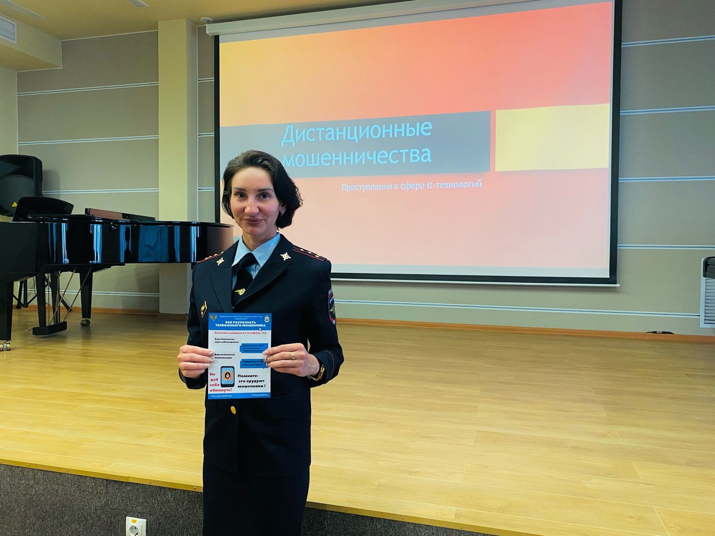 Капитан полиции Антонина Филлипова провела профилактическую беседу в "Детской школе искусств №2" , где рассказала об основных видах дистанционных преступлений и мерах профилактики.