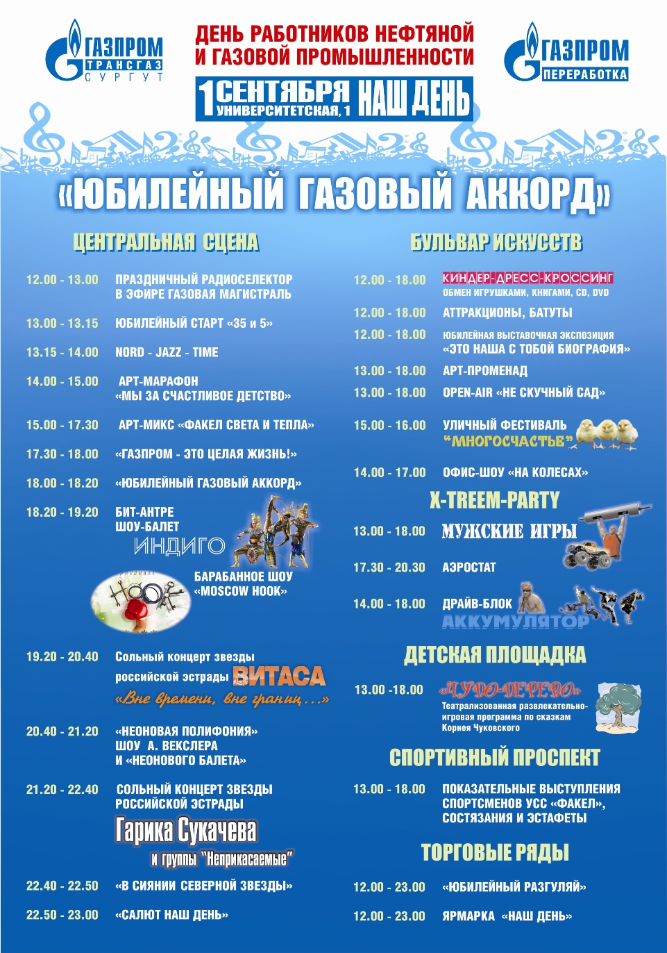 ·            12.00 – 23.00 – мероприятия, посвященные Дню работников нефтяной и газовой промышленности, «Юбилейный газовый аккорд». Территория ООО «Газпром трансгаз Сургут», ул. Университетская, 1. Программа