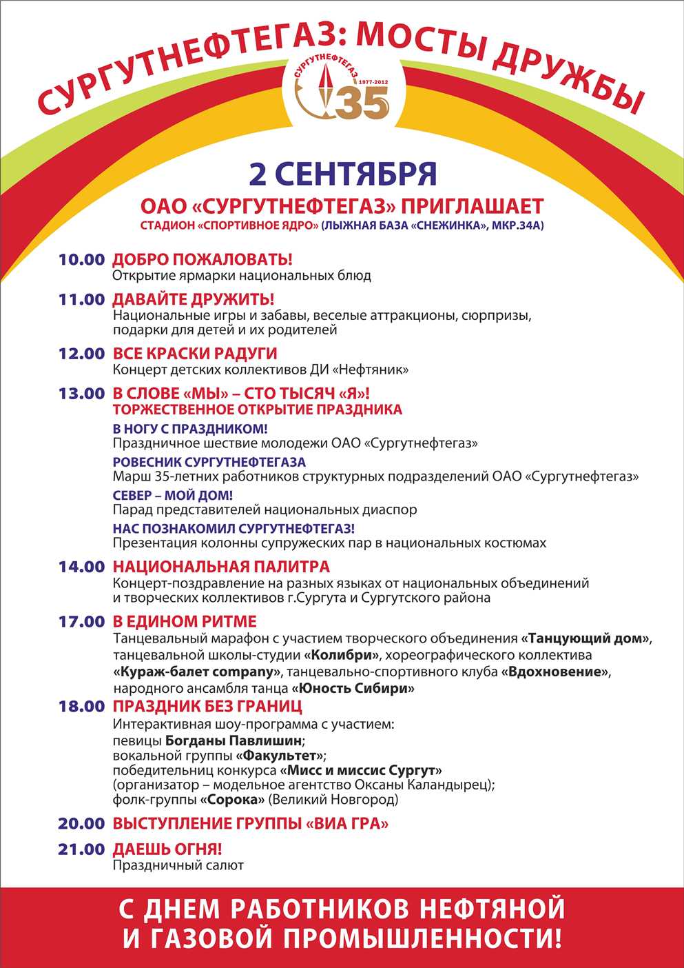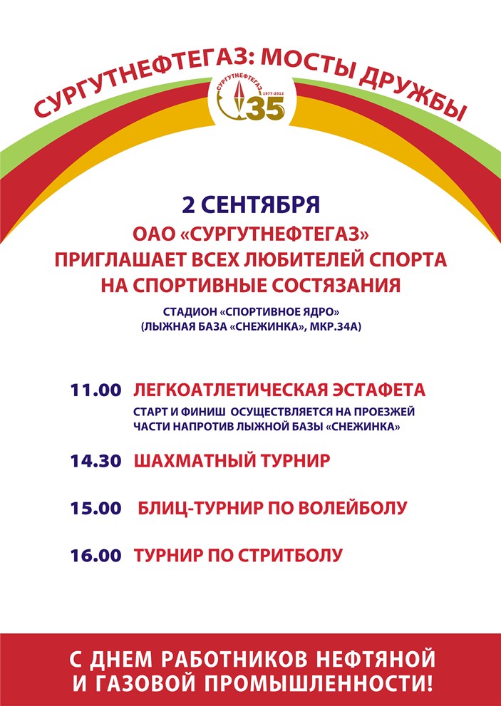 ·          10.00 – 21.30 – мероприятия, посвященные Дню работников нефтяной и газовой промышленности. ОАО «Сургутнефтегаз», стадион «Спортивное ядро», лыжная база «Снежинка», мкр.34А. Программа. Программа спортивных мероприятий.