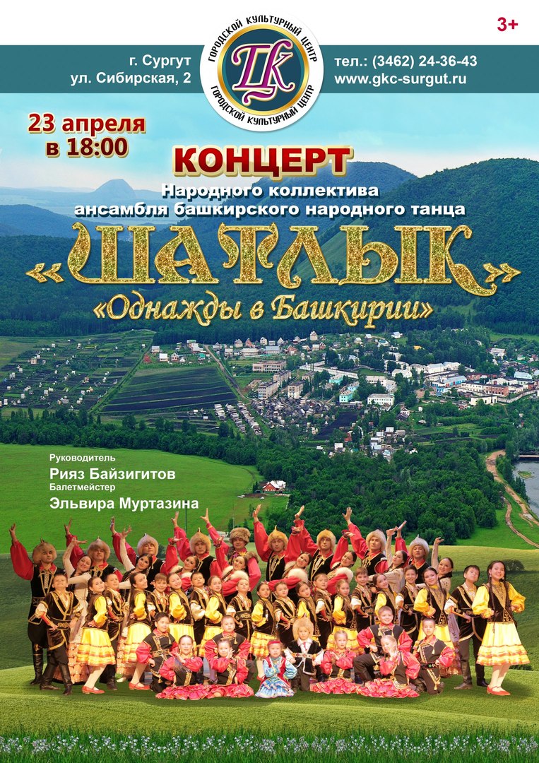 23 апреля в 18.00 на сцене МАУ «Городской культурный центр» состоится отчётный концерт Народного коллектива ансамбля башкирского народного танца «Шатлык» «Однажды в Башкирии», организатором которого выступили местная общественная организация «Башкирская национально-культурная автономия г. Сургута» (руководитель Италмасова Зульфира Тимерхановна) и муниципальное автономное учреждение «Городской культурный центр» при поддержке Комитета культуры и туризма Администрации города.