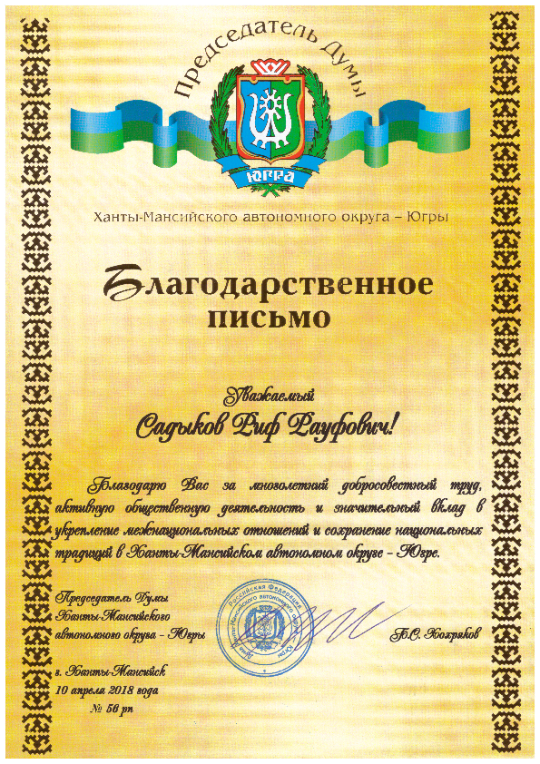 Сургутский общественник Риф Садыков награждён Благодарственным письмом Председателя Думы Ханты-Мансийского автономного округа – Югры