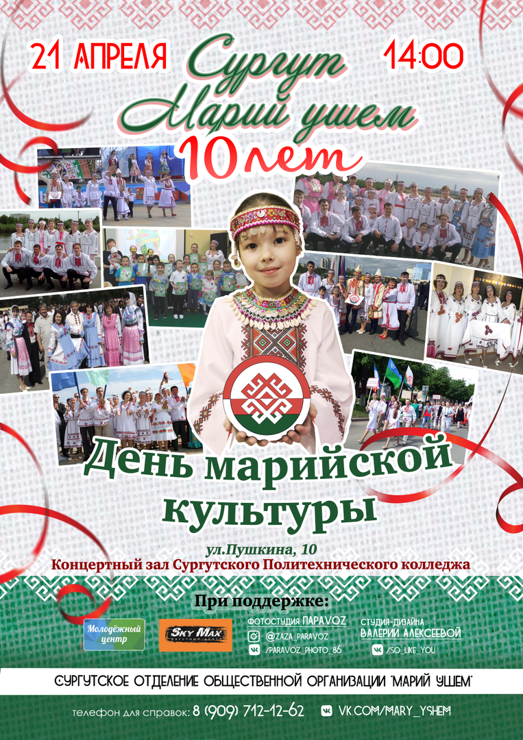 21 апреля 2018 года Сургутское отделение общественной организации «Марий Ушем» («Союз марий») отметит 10-летие со дня образования в нашем городе. В этот день марийцы Сургута приглашают всех горожан на концерт этнокультурного коллектива «ЮМарий», который действует при «Союзе марий».