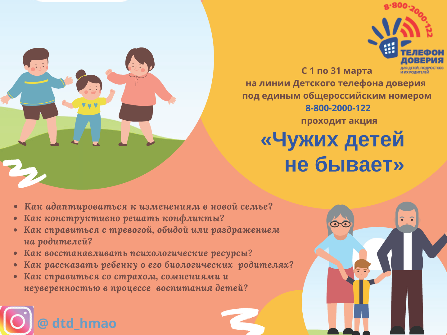 С 1 по 31марта 2021 года на линии Детского телефона доверия под единым общероссийским номером 8-800-2000-122 проходит акция «Чужих детей не бывает».